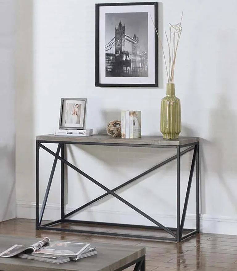 Casual Industrial-Inspired Sofa Table in Sonoma Grey with Metal Base for Modern Living Spaces