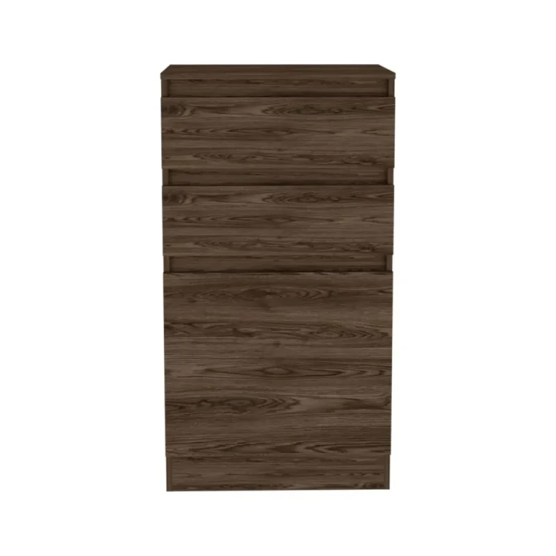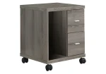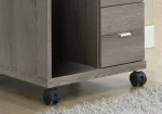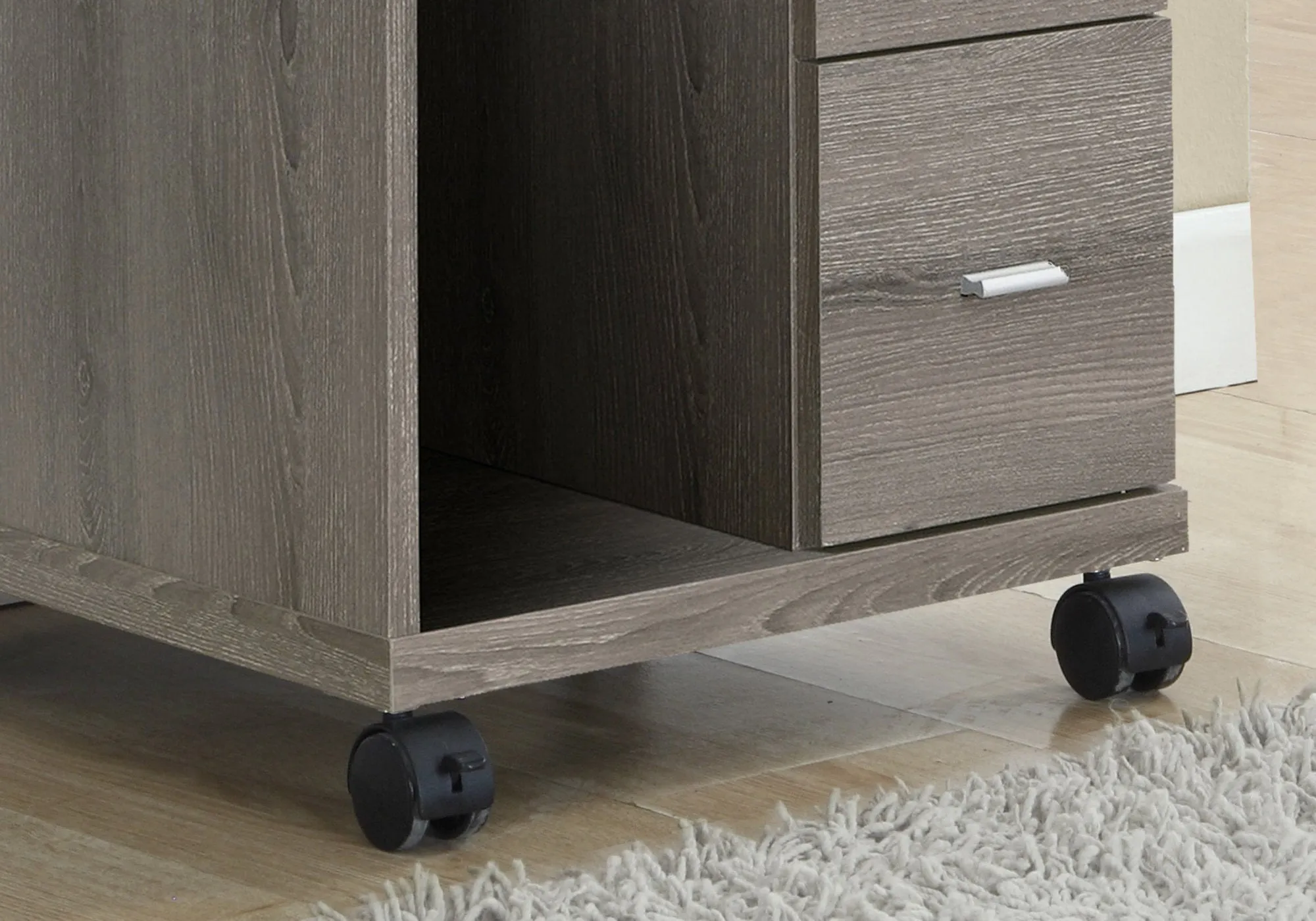 This mobile stand is the perfect combination of contemporary design and functionality. Finished in a dark taupe wood-look with sleek lines and thick panels, this cabinet will add modern appeal to any home office. It features two drawers for added storage,