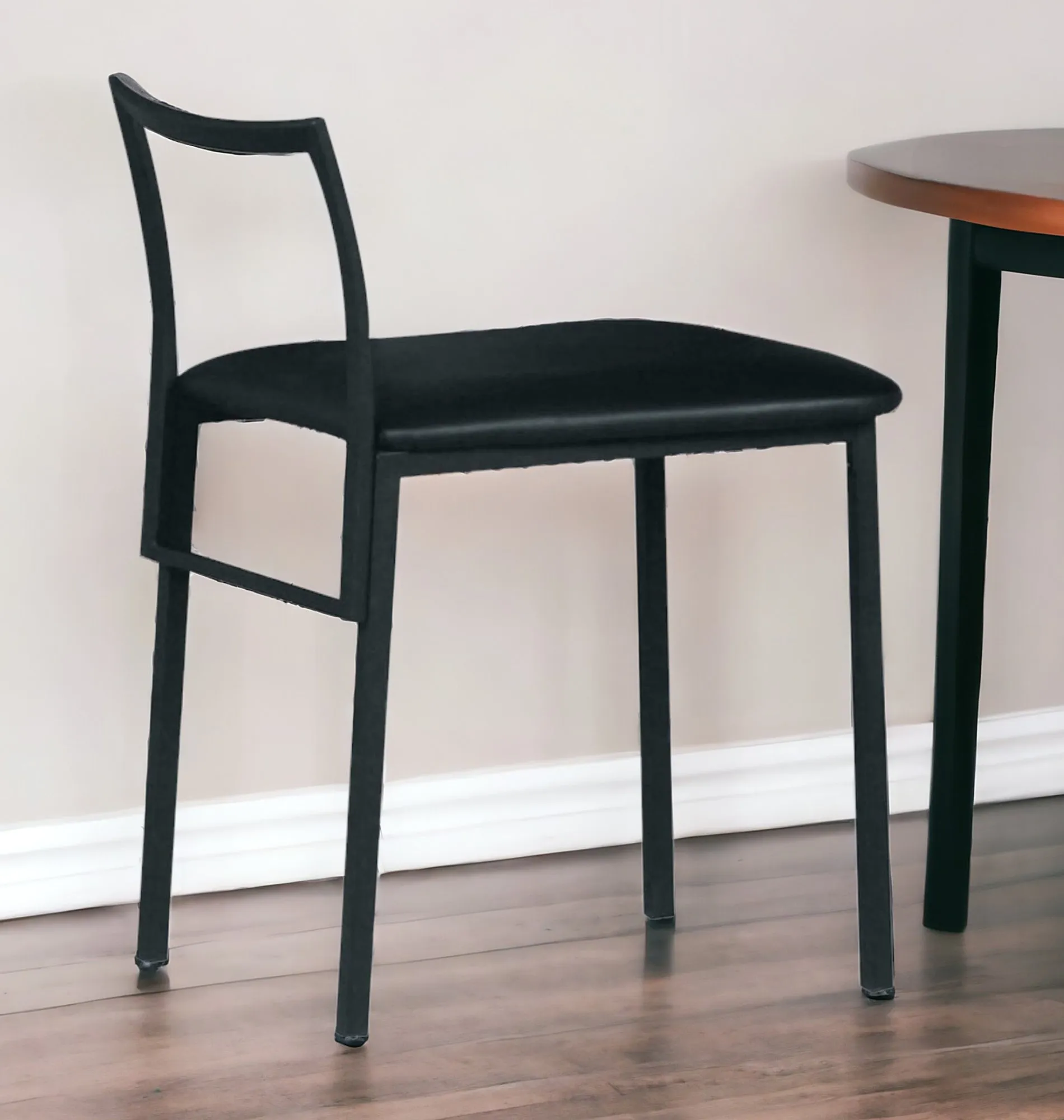 Unique and decorative, this 17-inch black faux leather side chair, with solid color upholstery, is a stunning addition to any room. The metal legs in matching black provide sturdy support, creating a stylish contrast. Expertly upholstered in durable faux leather, this accent chair exudes sophistication and elegance. The sleek design and modern aesthetic make it a perfect choice for a contemporary living space. With its sturdy metal frame and comfortable upholstery, this accent chair combines style and functionality seamlessly. A versatile piece that effortlessly enhances the ambiance of your home. 26-inch H x 17-inch W x 19-inch D