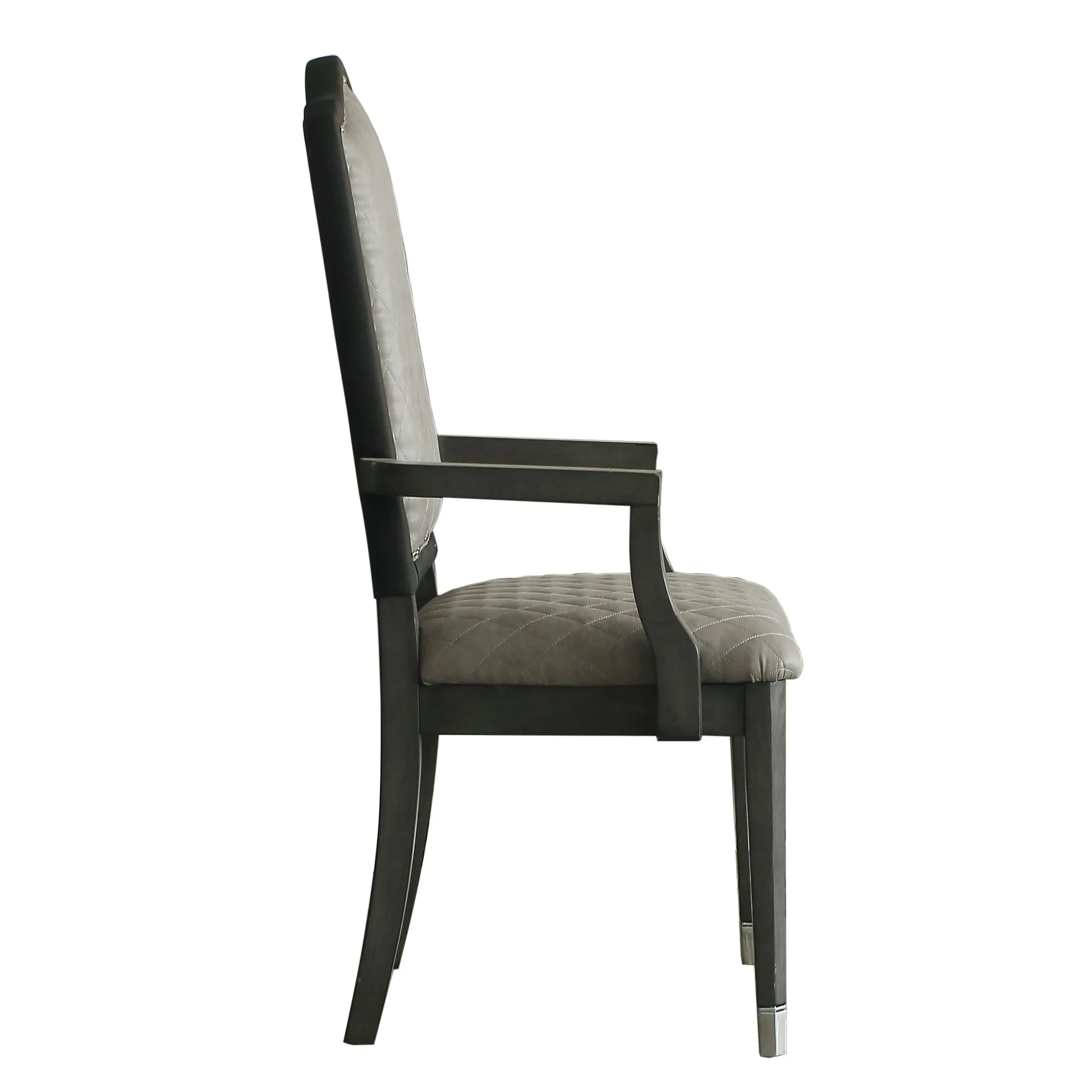 Elevate your space with the sophisticated charm of our Two Tone Grey and Charcoal Upholstered Back Arm Chairs. This set of two arm chairs exudes modern elegance with its grey upholstery adorned with a chic diamond grid pattern on the seat and back cushions. The addition of nailhead trim accents elevates the design, offering a touch of refinement and luxury. Crafted for both style and comfort, these chairs feature plush seat and back cushions upholstered in high-quality fabric or leather, ensuring a cozy and inviting seating experience. Whether placed in your dining room, office, or any room in need of a statement piece, these arm chairs will instantly enhance the aesthetic of your space.