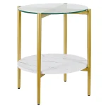 Optimize your space and add some charm to your room with the 22-inch gold and clear glass and steel round end table with shelf. The clear glass top of this table is a nice contrast to the high quality, gold steel of the base. Help to keep your space organized with the included single shelf. An ideal location for placing your snacks and drinks, and a place to keep your lamp, frames, or other accessories. This versatile table is a great accent for most any room. 22-inch H x 20-inch W x 20-inch D