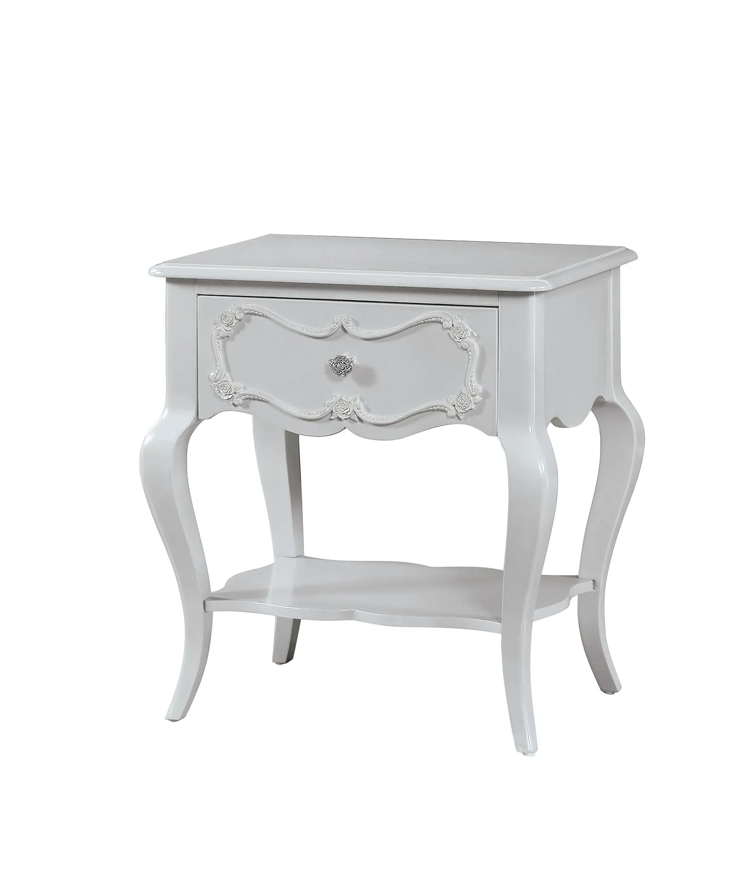 The alluring beauty and classic style of this nightstand will surely transform the hollow of any bedroom into something spectacular. Its sleek curves and design offer a perfect accent to the existing decor in your living space. This masterpiece features a drawer and a bottom shelf for safekeeping personal stuffs like novels, jewelry box or cosmetics. The unique design is solidified by the scalloped apron and the scrolled and rose inlay detail on the front drawer. the intricate design makes it an ideal piece for your kids room.