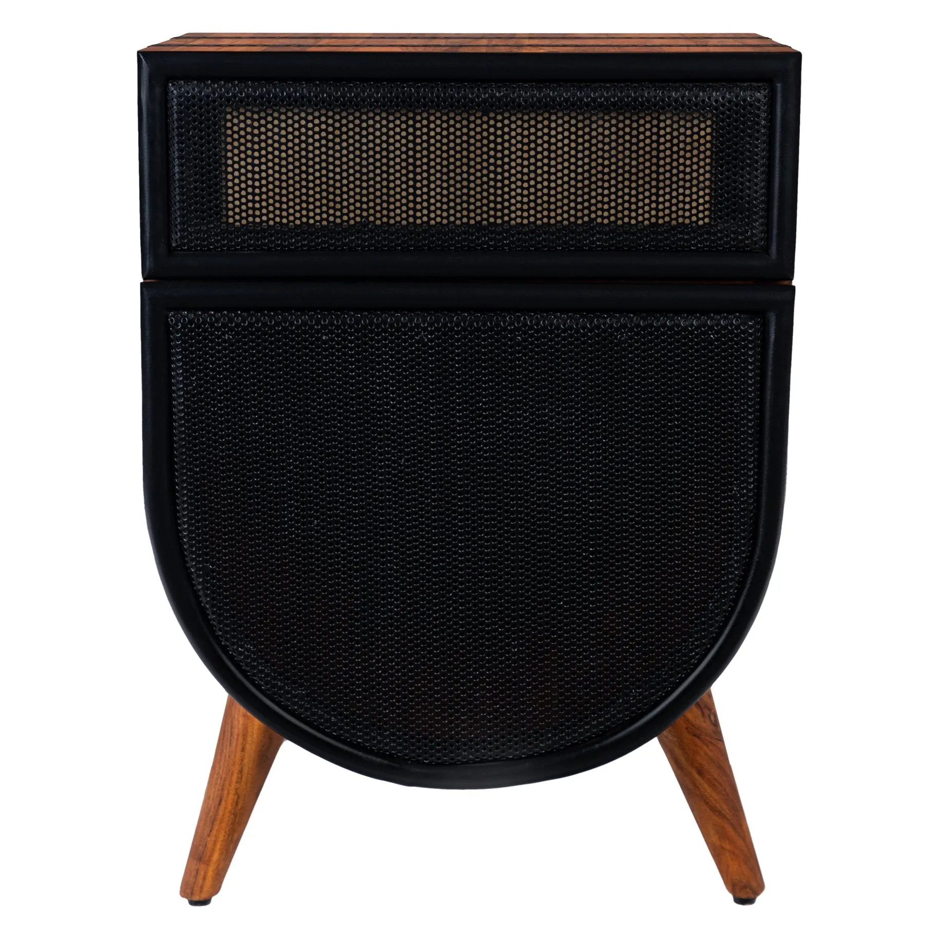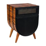 Expertly handcrafted, this accent wooden cabinet chest makes a charismatic and useful addition to your bedroom, office, living room, foyer, or lounge. Featuring a smooth gliding drawer and a soft closing door with hinges, the mesh designed drawer panel and door exhibit intricate workmanship. Crafted from acacia wood and pleasing metal trim accents, the piece is supported on sturdy angled legs. The warm brown accented wood compliments the black powder coated metal, while the top of the piece offers a sophisticated area to place your decor, photos, table lamp, and easy to reach items. The rich wood grain details exude a nature inspired charm, and the rounded drum shape structure of this piece brings a distinct yet bold character.