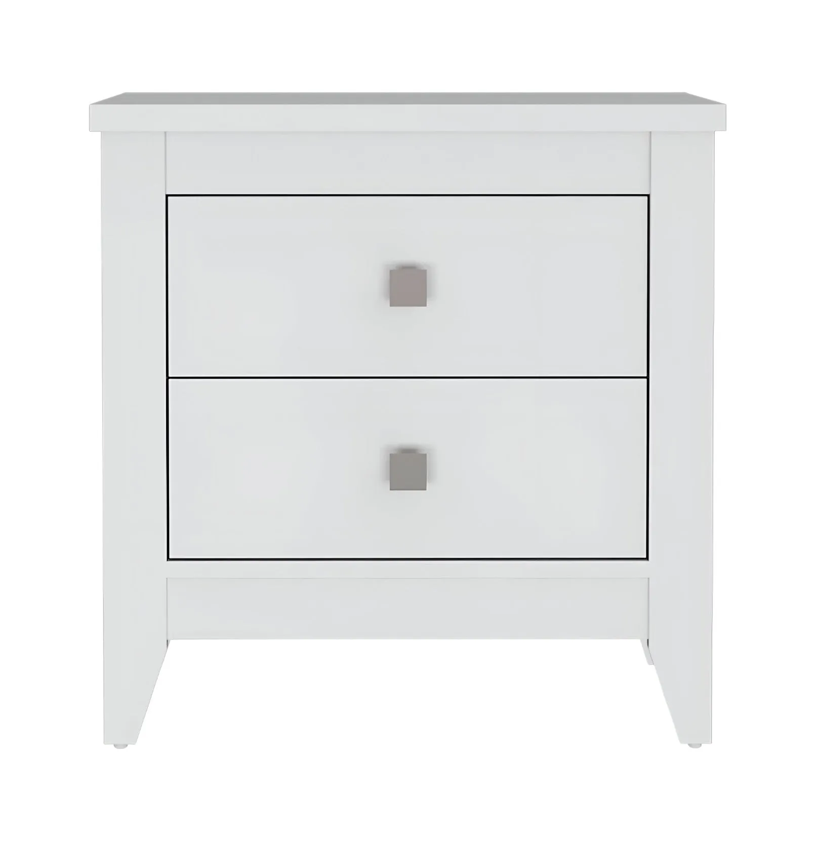 Good looking design and practical styling meet to form this 24-inch white two drawer faux wood nightstand. Made of high quality manufactured wood that is built to last. Includes 2 drawers to give you multiple storage options to keep clutter at bay. The unsung hero of the bedroom, this nightstand is perfect for keeping a glass of water, lamp, alarm clock, jewelry, and more, close by and easily accessible. Nightstands are obviously great beside the bed but can be used just as easily to help battle clutter in your living room, hallway, office, or dining room. 24.25-inch H x 26.62-inch W x 15.74-inch D