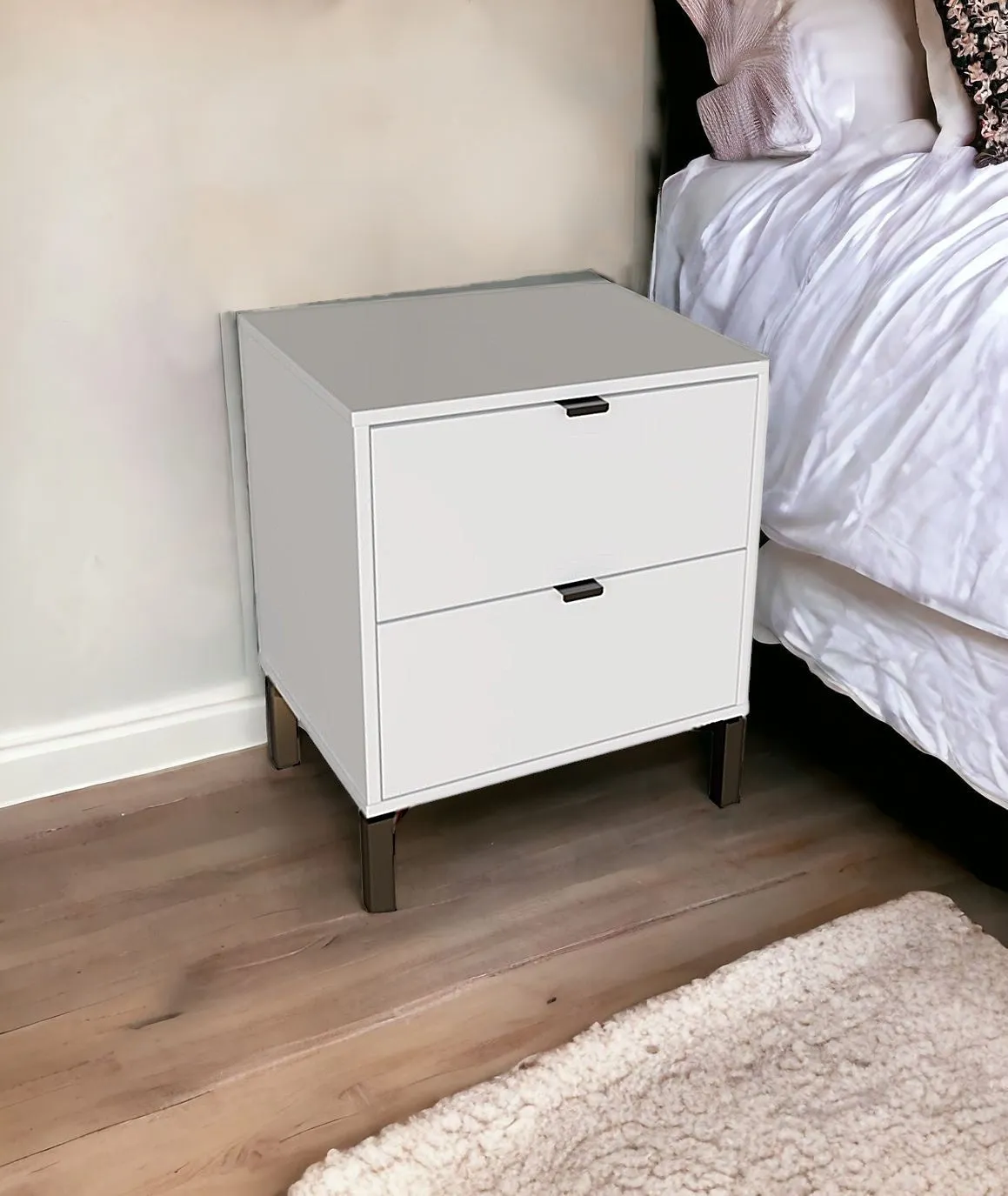 - Modern and minimalist two drawer nightstand or bedside table.