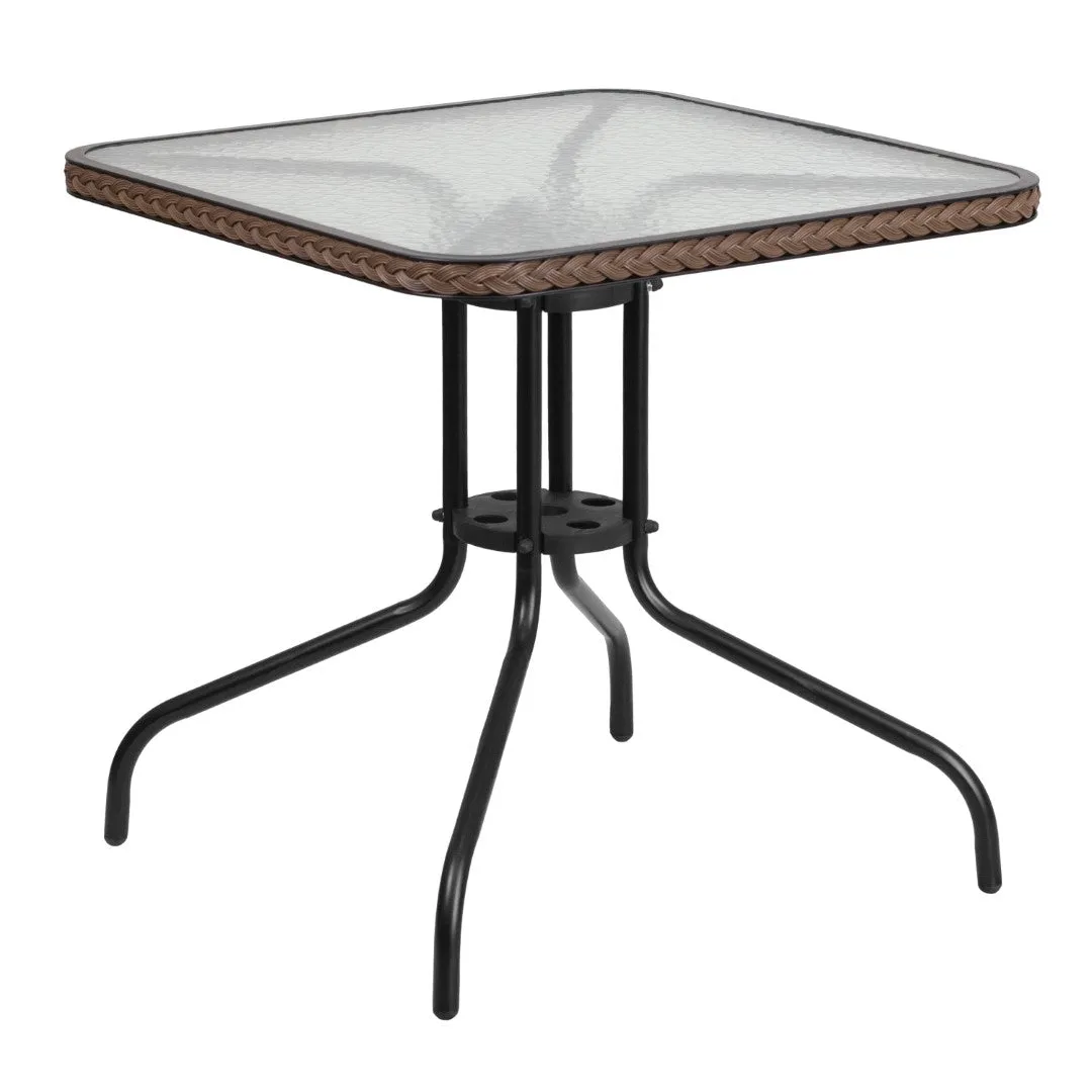 Introducing the Commercial Grade 28” Square Tempered Glass Metal Table with Dark Rattan Edging, a versatile and stylish addition to your indoor or outdoor space. This patio table features a sleek top measuring 28 square inches, supported by a sturdy base with a width of 25.5 inches, providing ample space for dining or gathering. The table boasts a clear tempered glass surface that is 5mm thick, offering durability and a modern aesthetic. Adding a touch of elegance, the table top is accented with a 1.375-inch edge adorned with a decorative dark brown rattan edge band, complemented by a sophisticated black powder coat finish.Key Features and Specifications: