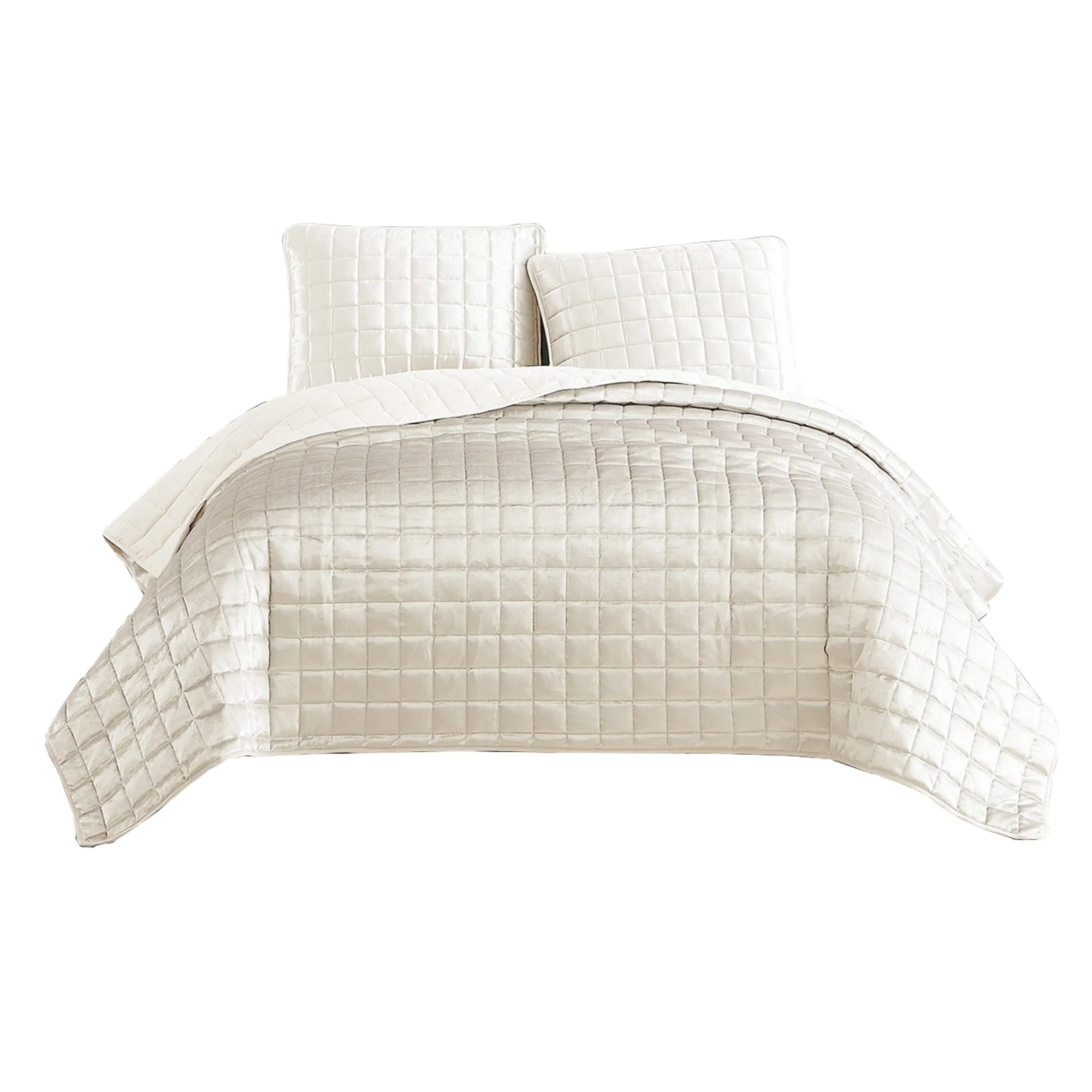 Accentuate your bedroom with this cozy King size Coverlet set that includes 1 quilt and 2 pillow shams. Made from cream in polyester material with elegant stitched details forming a square pattern that gives an appealing look. It is safe to toss in the washing machine for effortless upkeep and comfortable companion to your bed.