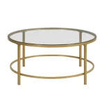 Add handsome, fashionable design to your living space with this 36′ gold and clear glass round coffee table. A gold metal frame is finished off with a clear glass top that is the epitome of quality construction and design. This round table features a fresh and stylish shape to give your room a visually pleasing accent. It has a fresh design that will definitely breathe some fresh air into your interior. This coffee table is the sturdy, reliable and stylish answer to your living room needs. 16.5′ H x 26′ W x 26′ D