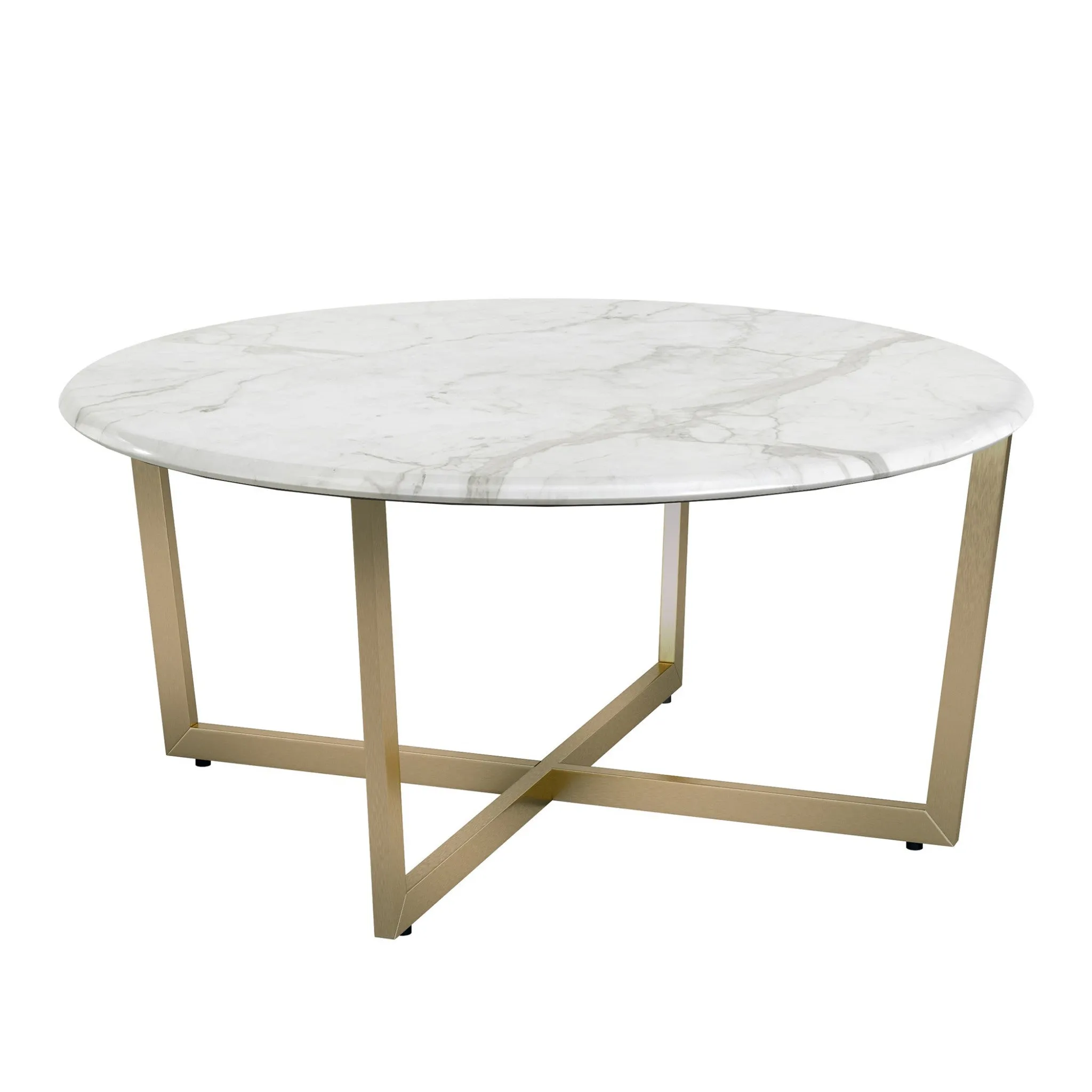 Give your living room, family room, or office the perfect anchor piece with this 36-inch white and gold faux marble round coffee table. Stylish and super sturdy, the gold coloration of the high quality x cross metal base marries nicely with the white faux marble design manufactured wood top surface. If you’re looking for something that can fit into a living area, bedroom, or office, this coffee table is for you. This round table is the sturdy, reliable and stylish answer to your living room needs. 15.75-inch H x 36.03-inch W x 36.03-inch D