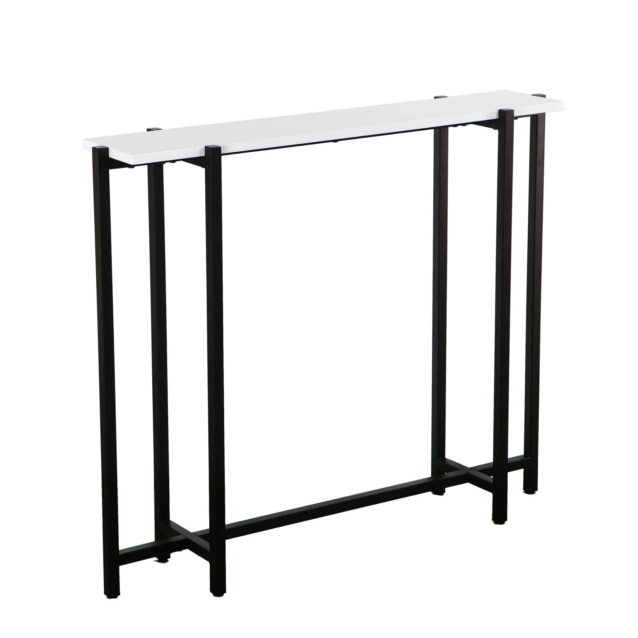 This 36-inch white and black frame console table can provide a variety of practical functions such as providing extra storage space, serving as a display area for decorative items or acting as a catch-all for keys, mail, and other small items. This rectangular table has clean lines and plenty of surface area. This table has a top made with white manufactured wood that is known for durability and easy maintenance. Ideal for living rooms, bedrooms, home offices, and lounge areas, this console table is not only good looking but multi-functional and practical addition to your space. 29.75-inch H x 36-inch W x 8-inch D