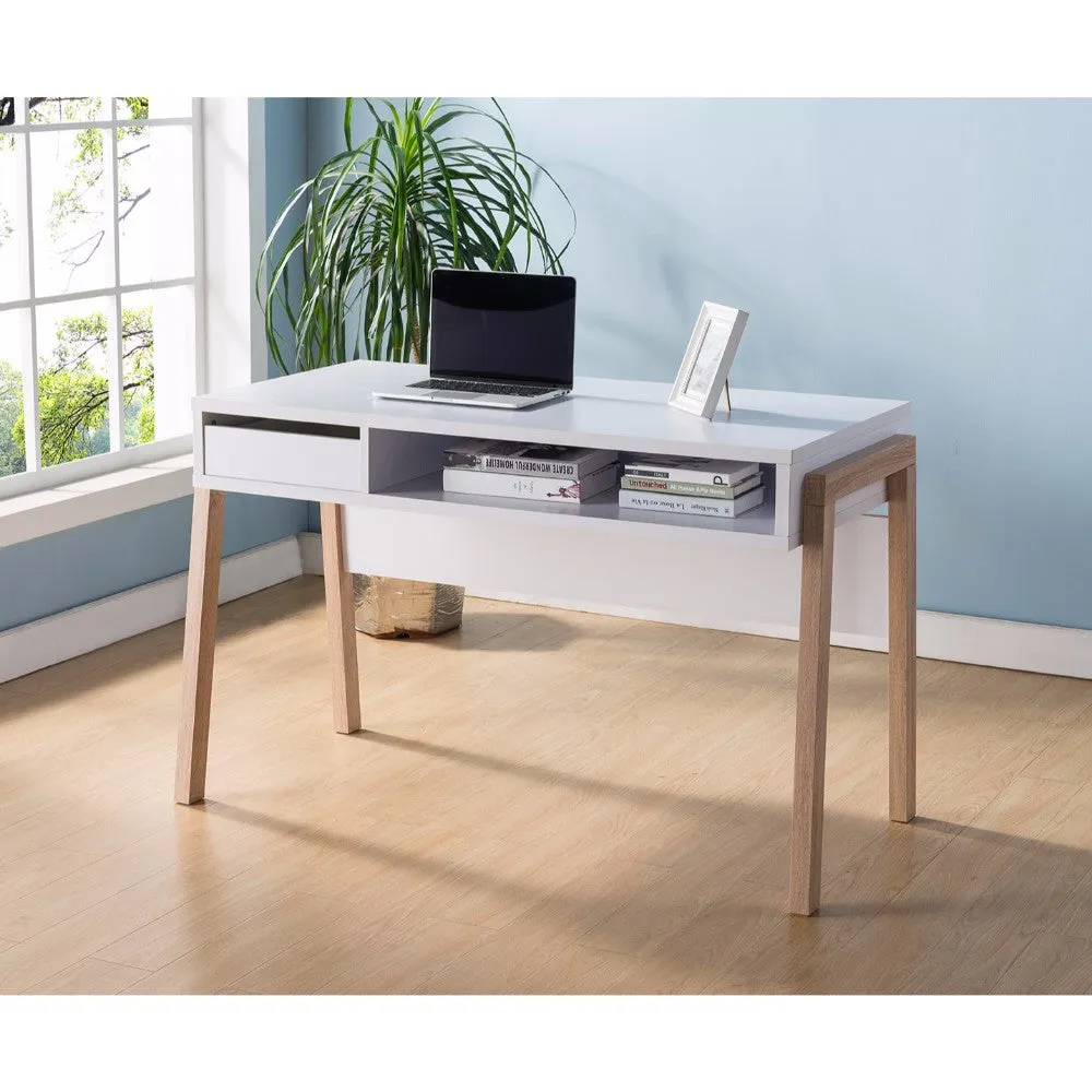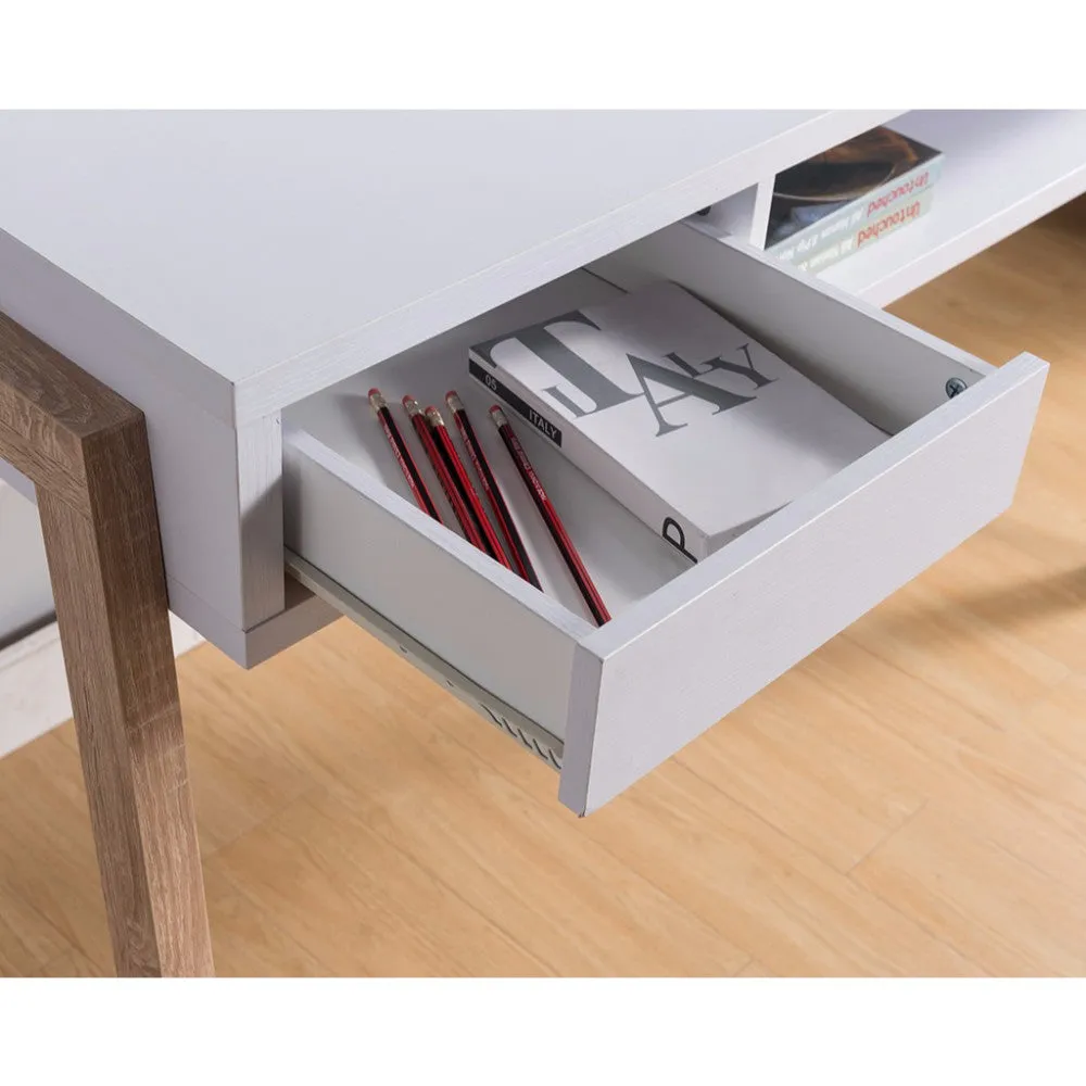 Modern glamour meets a touch of countryside appeal with this home office desk, a gorgeous fit for your work space or home office. With a white lacquer finished rectangular tabletop, it features a smooth gliding drawer and a large open cubby to keep stationery, electronics, and office supplies organized. The built in power outlet and two USB ports come in handy while charging phones and connecting your electronics to a nearby power source. Handcrafted from a premium grade composite wood frame, it is supported on sturdy angled legs in a natural brown finish with subtle wood grain details. This home office desk harmonizes with virtually any decor style, be it contemporary, transitional, rustic, or Scandinavian.