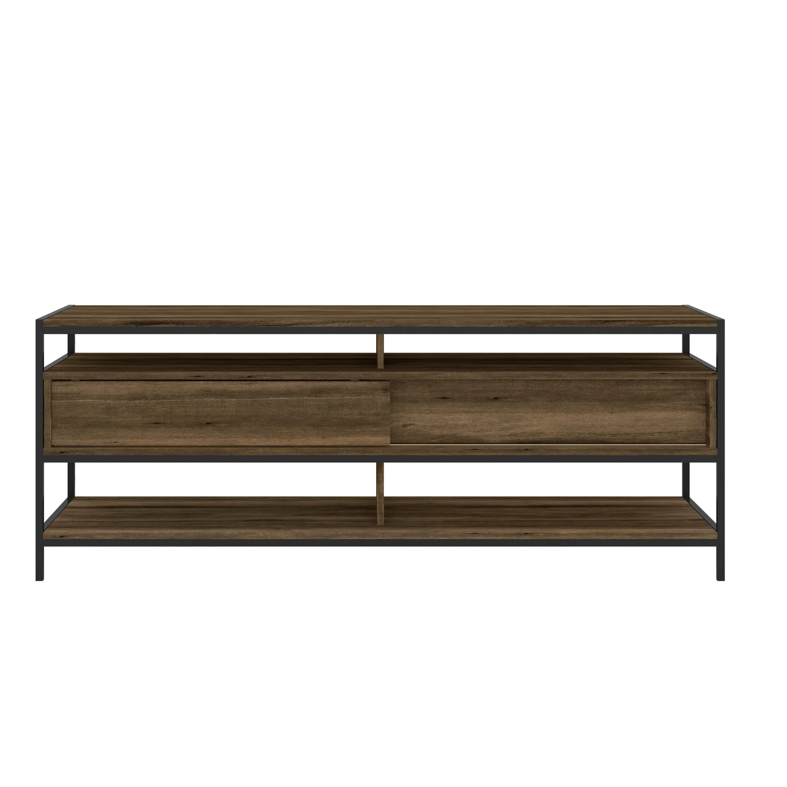 Provide a sophisticated abode to all your media gadgets by bringing in this contemporary style TV Media Console Stand which offers spacious storage with its 2 drawers and open compartments. Constructed from the combination of particle board and metal, this entertainment center for your flat screen TVs is accented with brown and black finish.