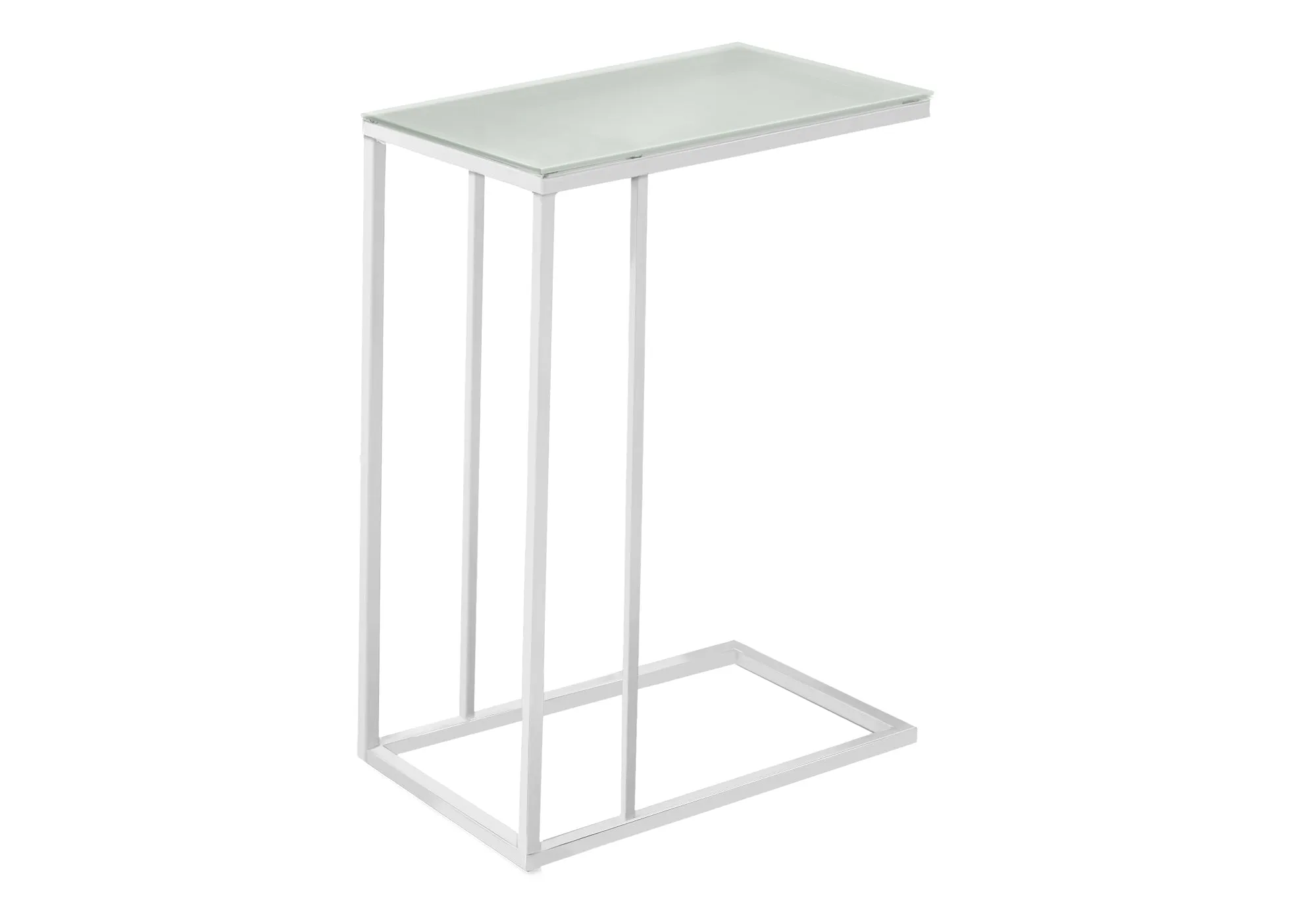 A perfectly tapered accent table that fits independently with any furniture in your home, this rectangular table features a frosted tempered glass surface perfect for you snacks, drinks, meals or tablet. The white metal base easily slips under a sofa or chair and provides sturdy support along with a fashionable touch that will suit any decor. A multi functional accent piece ideal for a living room, family room, den, home office.