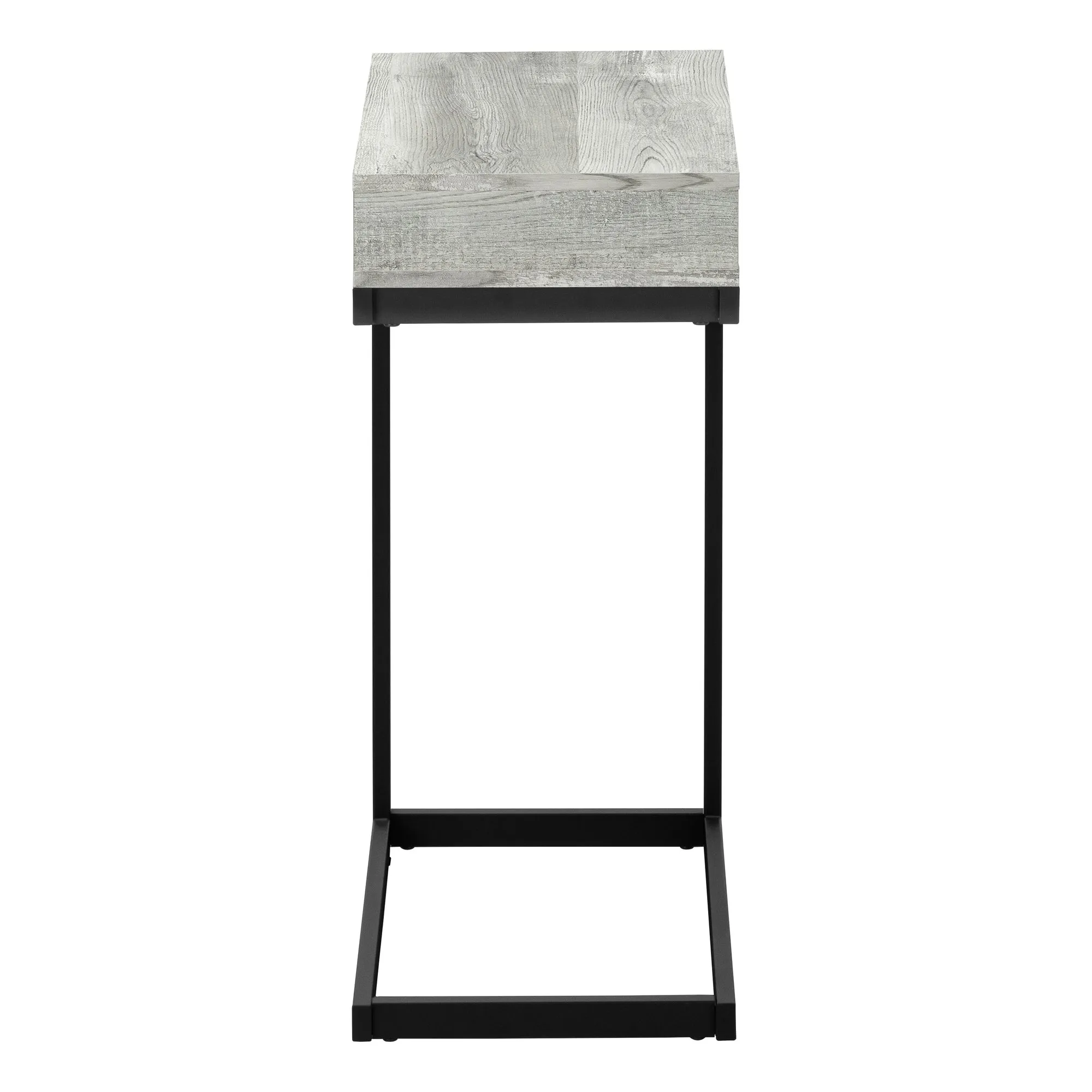 - Thick panel rustic wood look finish in grey brings a traditional touch to the contemporary design of this C table