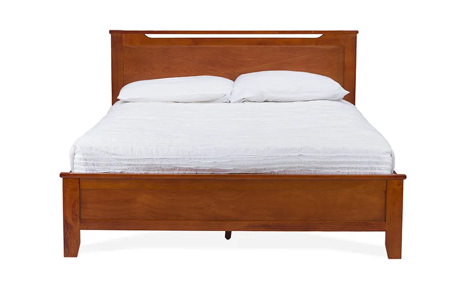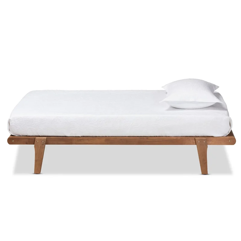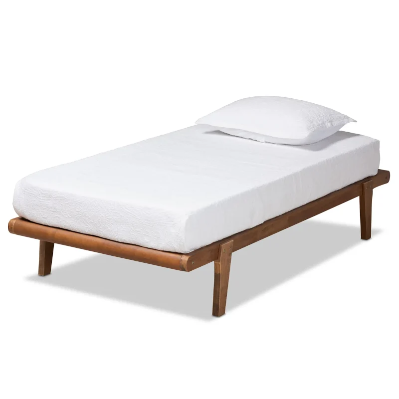 Bring modern style to the master bedroom or guest room with the retro detail and organic aesthetics of the Alana Wood Twin Platform Bed. Inspired by mid-century design, the twin headboard of this wood bed features beautiful wood paneling and contemporary accents. This platform bed frame is a sturdy addition to the bedroom with a durable wood, MDF, and veneer construction and angular rubberwood legs. Eliminating the need for a box spring, this twin bed is complete with a wood slat support system, reinforced center beam, and supporting legs that make it a lasting mattress foundation for memory foam, latex, innerspring, and hybrid mattresses. Assembly required. Twin Bed Frame Weight Capacity: 601 lbs.