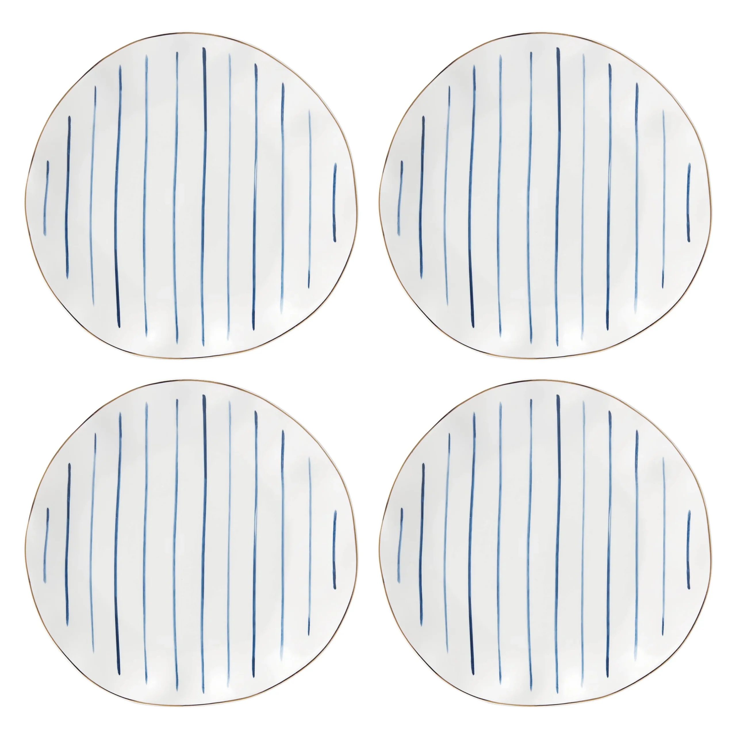 Made for those who like to mix it up, these sweet and simple dinner plates bring a breath of fresh air to your table with a striped, textile-inspired pattern and gold-accented organic edges. Whether for serving, entertaining, or simply enjoying, this set elevates your everyday with its playful look, breezy spirit, and attention to detail.