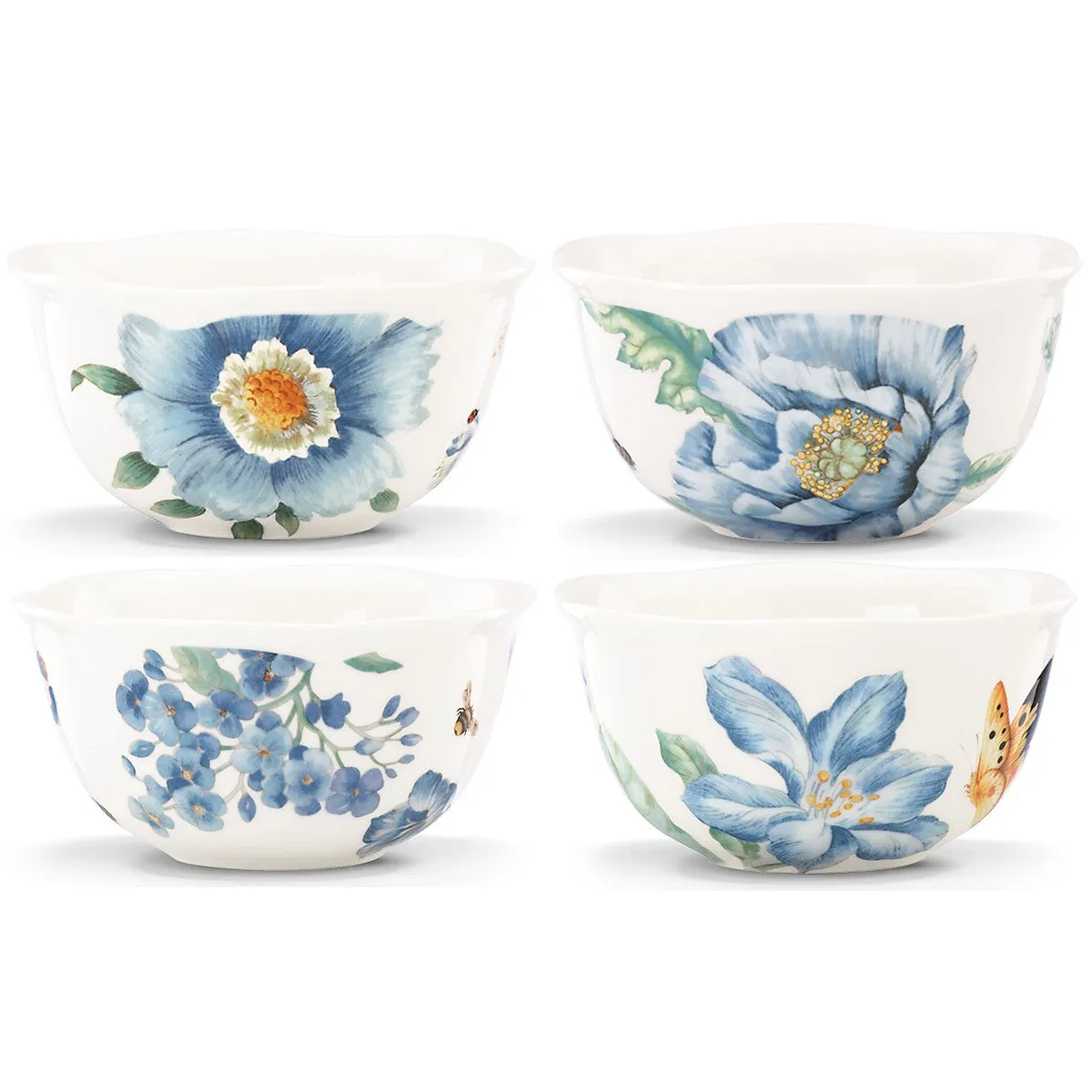 Delightful motifs of vibrant butterflies and soft blue flowers decorate the sides of these charming dessert bowls. This 4-piece set is crafted of durable porcelain and is microwave and dishwasher safe.