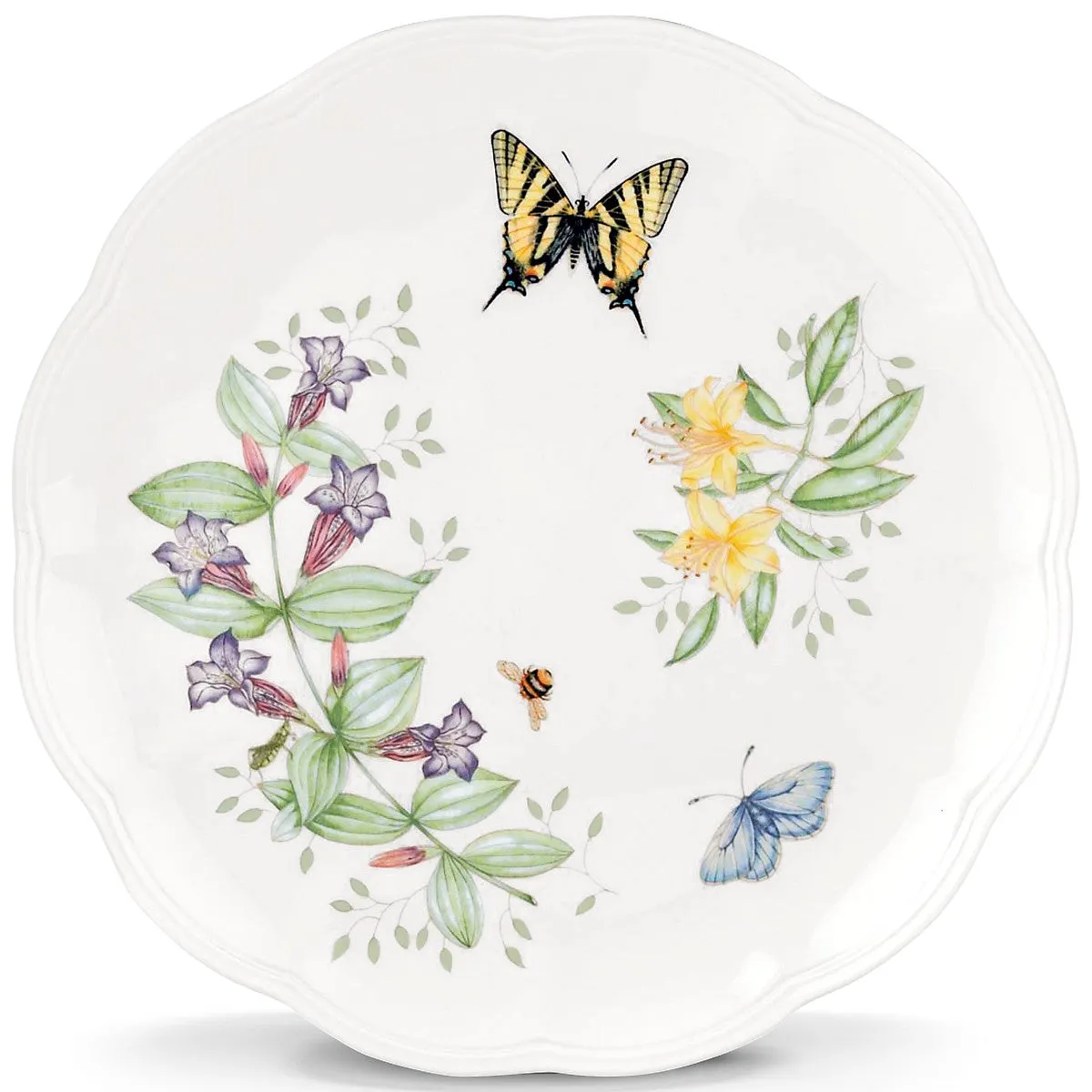 Lively butterflies and bees buzz about a soft floral design on the Butterfly Meadow Tiger Swallowtail Dinner Plate. The trademark design features elegant scalloped edges on durable white ceramic porcelain. This mix-and-match classic is crafted for outstanding freezer-to-oven-to-table performance, and is microwave and dishwasher-safe.