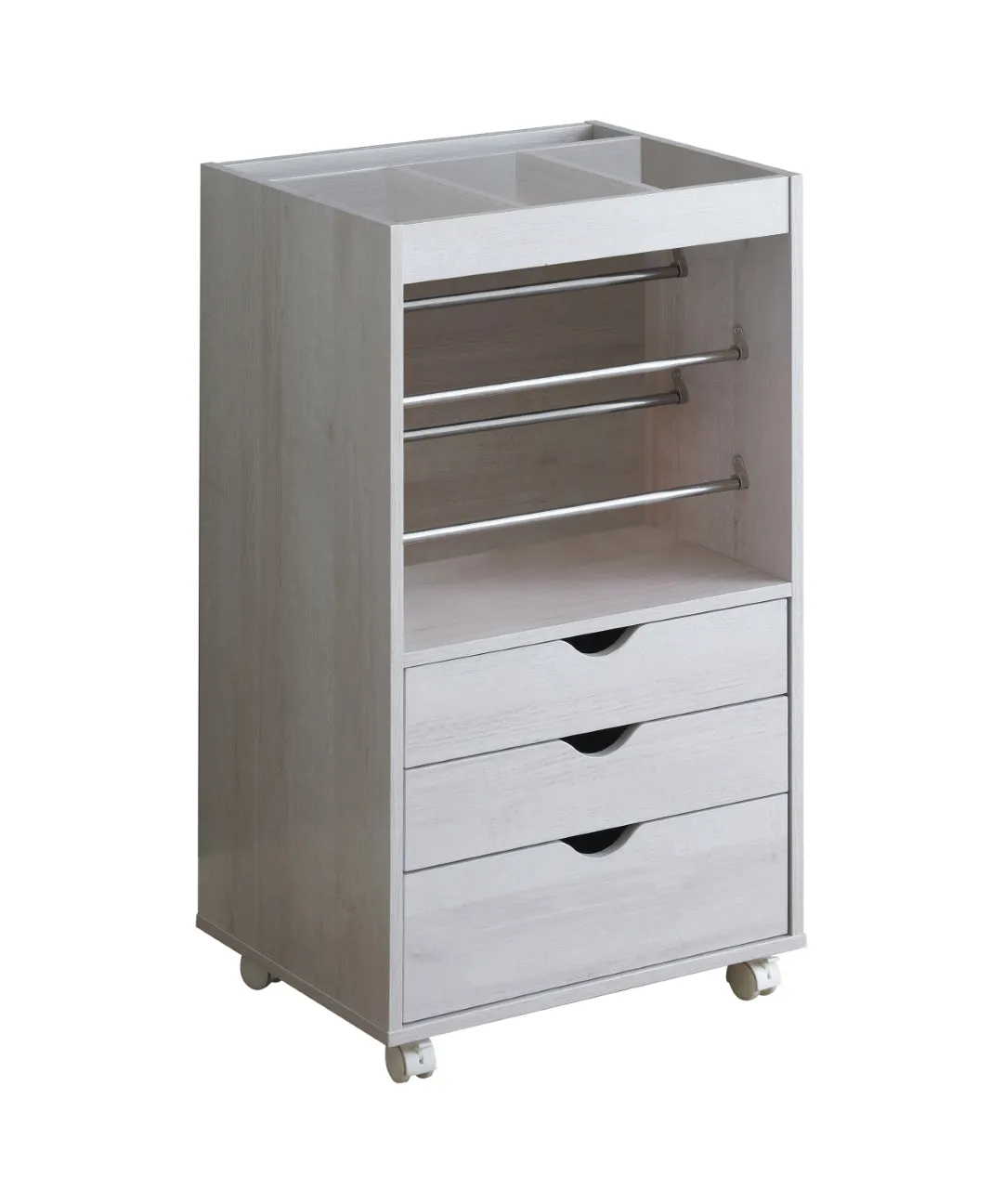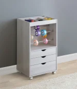 This attractive storage cabinet is a crafter’s delight. The tabletop is constructed of compartment naviders for organization. Below, metal bars are assorted for hanging items within close reach. Three storage drawers conceal extra items out of sight. This mobile storage cabinet is finished in white and supported on wheels.