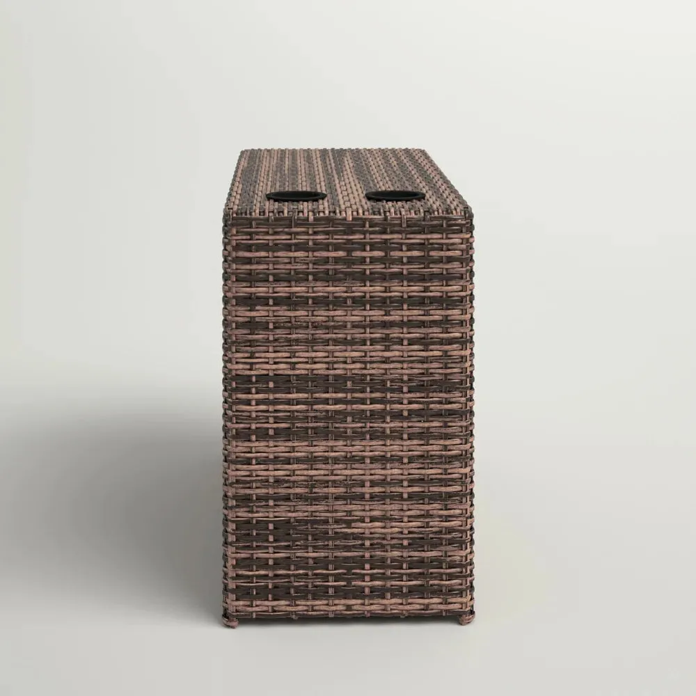 Crafted with a sleek and slim rectangular frame, this outdoor side table measures 13 x 33 x 22 inches, providing ample surface area for your drinks, books, or decorative items. The powder-coated aluminum frame ensures sturdiness and longevity, while the rich espresso-hued resin wicker adds a touch of coastal charm to your outdoor space. With two built-in drink holders, you can easily keep your beverages within reach as you relax and unwind outdoors. Designed to withstand the elements, this table is the perfect companion for enjoying sunny days and breezy evenings in style. Elevate your outdoor experience with the Coastal Vibes Outdoor Side Table.
