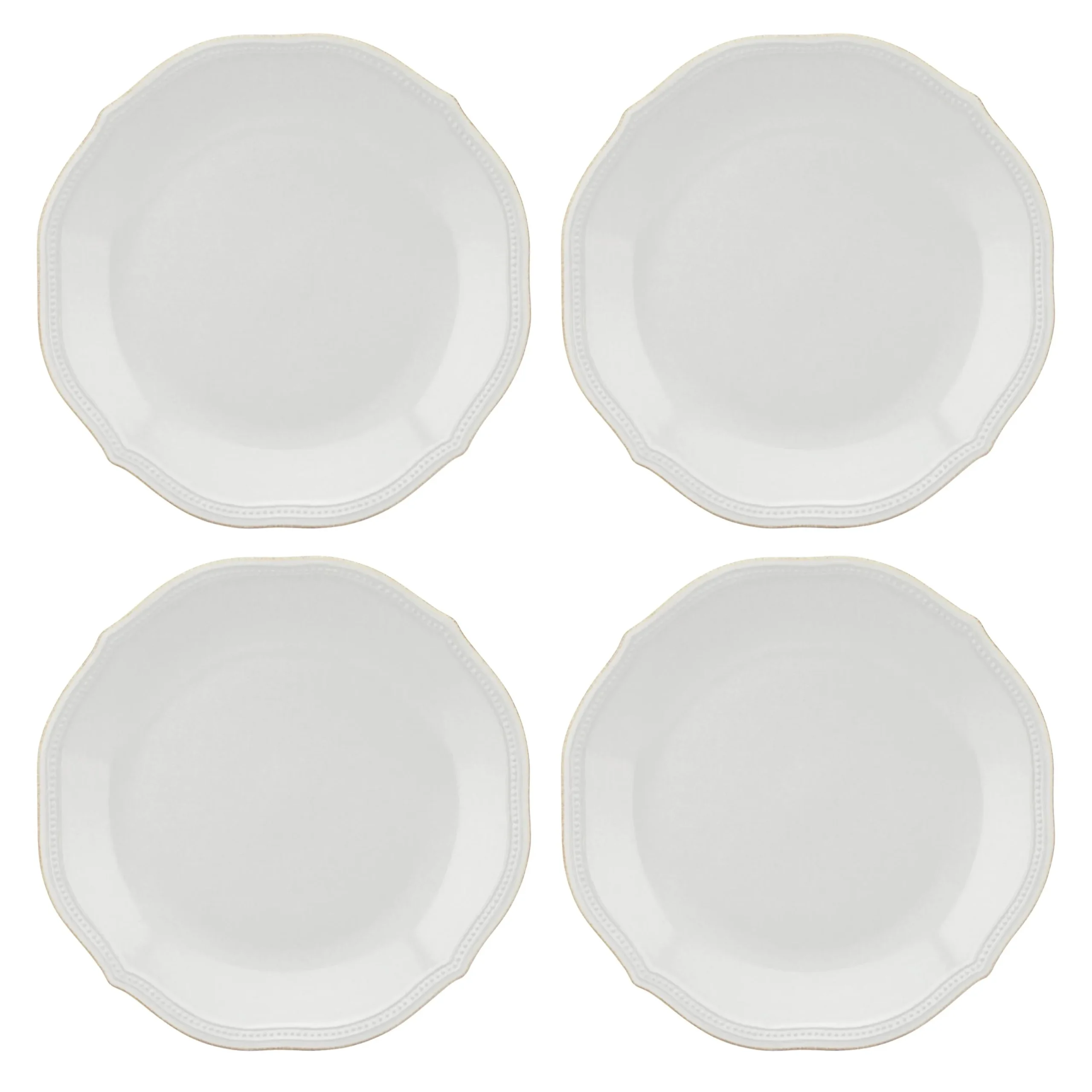 Crafted of durable ceramic stoneware and featuring a delicate scalloped border with raised dots, this four-piece dinner plate set is a classic, versatile choice for everyday dining. Plates are microwave and dishwasher safe for added convenience.