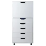 Use the Winsome Wood Halifax 5-Drawer High Storage Mobile Cabinet for a variety of organizational needs. A clean, simple design that you will find function to in just about any room of your home. Featuring a multitude of drawers that will help eliminate the appearance of clutter with convenient cut-out handles that allow for easy-open access. The vertical design allows for minimal floor space to be taken up, while still proving plenty of storage. Ideal for a bedroom, craft room, dorm or even kitchen. It is the perfect organizer for your knitting, sewing, or craft supplies. Or expand your storage for jewelry and styling accessories. Rejuvenate your home-office or den as this unit is well-suited for documents and files, and plenty of space for keeping charging cables and office accessories neat and organized. The top cabinet has a spacious interior of 17.95’W x 14.76’D x 14.57’H, allowing for taller items such as a backpack or handbag, making it adaptable to a variety of storage needs. With 5 easy-glide drawers at 16.06”W x 11.73”D x 2.56”H, that provide ample storage for sorting items into 1 of 5 drawers. Sitting on four wheels, two of which lock, so you can move with ease or keep securely in place. An easy to clean, sturdy composite wood construction finished in a crisp, white that makes this simple, contemporary design certain to brighten any space. Combine this unit with other cabinets from the Winsome’s Halifax collection to create infinite storage options (each sold separately). Ships in one box with the hardware necessary for assembly. Replacement part request can be submitted directly to the manufacturer within 60 days from date of purchase.Overall dimensions: 41.49’H x 19.21’W x 15.98’DDrawer inside dimension 16.06’W x 11.73’D x 2.56’HStatic weight capacity: -Top: 25lb. -Compartment: 25lb. -Drawer: 12lb. eachGround clearance: 2.2’Assembly requiredShips in 1 box