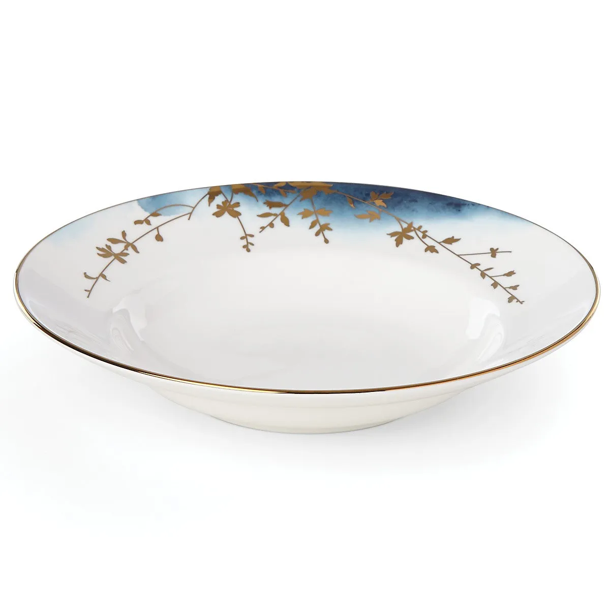 Naturally chic, the Highgrove Park Rimmed Bowl adds subtle elegance to soup and pasta dishes. Understated watercolor effects in calm blue shades are accented by shimmering microwave-safe gold floral silhouettes. This durable bone china bowl is microwave and dishwasher-safe.