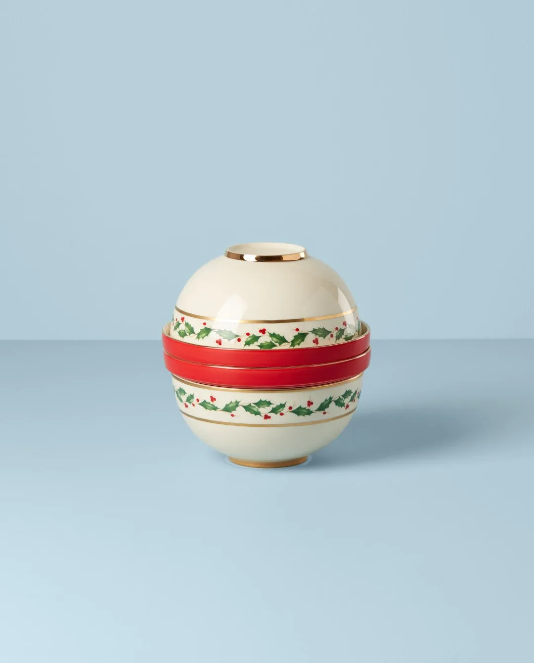 Our popular Luna Nesting Dinnerware Set now comes in our #1 Holiday pattern] It’s crafted of durable, long-lasting porcelain with everyone’s favorite Christmas design of holly leaves, candy cane stripes and luxe golden accents. This all-in-one nesting piece hides six bowls and two plates inside. Take it apart piece by piece to reveal each microwave-and-dishwasher-safe style. Put it all back together and it becomes a compact centerpiece for your table. This timeless set makes a wonderful keepsake you can pass down from generation to generation. Grab yours before it sells out]