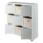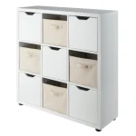 The Julian 3×3 Storage 5-Piece Cabinet Set by Winsome Wood is the answer to any and all organizational needs. With a total of 9 spacious compartments, the cabinet is ideal for a mudroom, garage, craft area, family room or kids’ bedrooms. Use all the compartments for storage, or combine them with display in the open cubbies. The unit comes with a set of 4 foldable baskets in a complementary beige color, providing yet more way to keep clutter out of sight. Made of sturdy composite wood, the cabinet has a clean, white finish and comes with attachable rubber feet to prevent floor scratches.