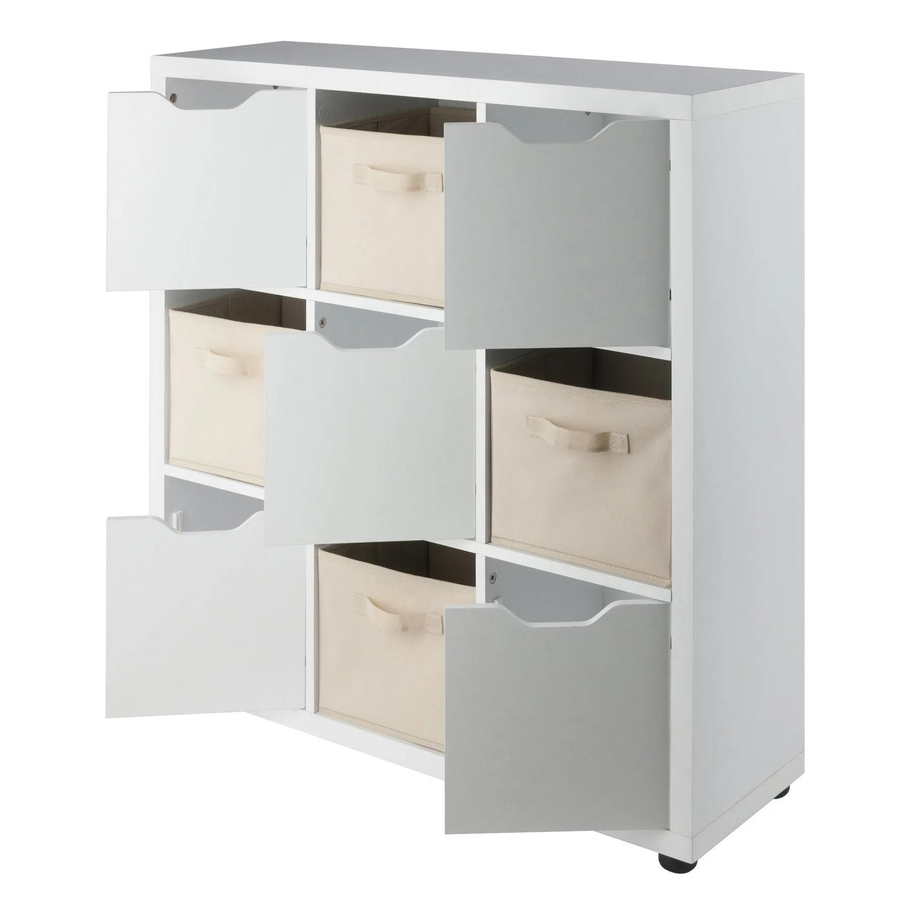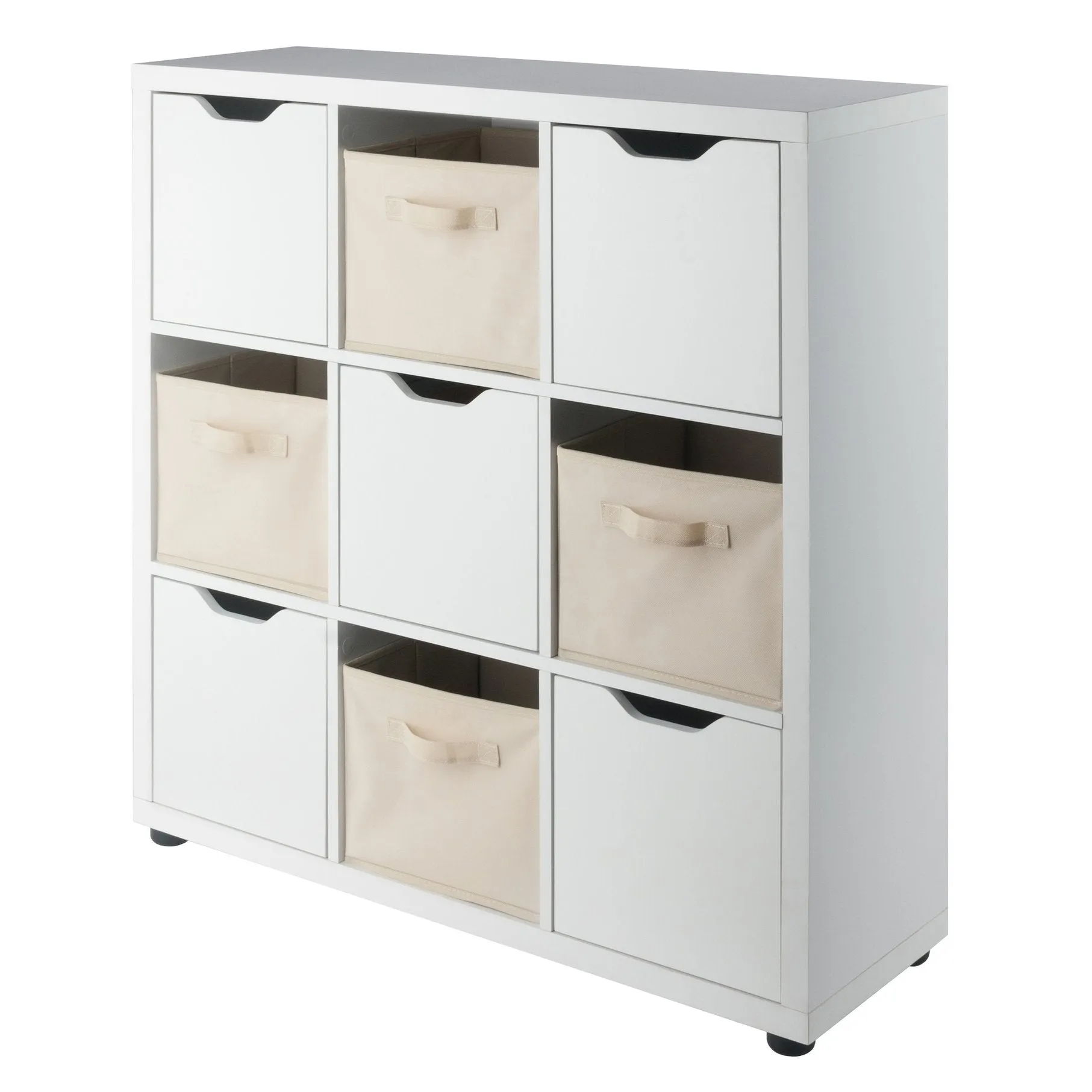 A busy life gets a lot easier with the right organizational tools. The Julian 3×3 Storage 5-Piece Cabinet Set by Winsome Wood is a great place to start while bringing a contemporary, stylish element to your home. The cabinet has a total of 9 spacious compartments: 4 are open for storage or display and 5 have doors with easy-access cut-out handles. The unit comes with a set of 4 foldable baskets in a complementary beige color, providing yet more way to keep clutter out of sight. It’s perfect for a mudroom to hold the entire family’s shoes, sports gear, hats and gloves. Or use it in the family room or kids’ bedrooms and let the youngsters decide how to organize their games, trophies, and schoolwork. The multiple compartments make the set an ideal piece for a craft room for storing yarn, quilting materials, or anything needed for your next project. Made of sturdy composite wood that cleans easily, the Julian’s crisp, white finish gives the whole unit a smart, fresh look. The cabinet comes with five rubber feet to prevent floor scratches and conveniently ships in 2 boxes with all the hardware needed for assembly. Overall dimensions: 36.6’W x 11.6’D x 37.6’H Inside cabinet compartment with door: 11.02’W x 10.39’D x 11.02’H Inside open cubby: 11.02’W x 11.02’D x 11.02’HTop static weight capacity 50 lbs.Each compartment weight capacity 30 lbs.5 rubber feet 50mm diameter x 25mm heightBasket open dimensions: 10.06’W x 10.97’D x 9’H – folds flat for storage when not in use – made of polyurethan fabric with reinforced fiberboardAssembly required for cabinet onlyShips in 2 boxes