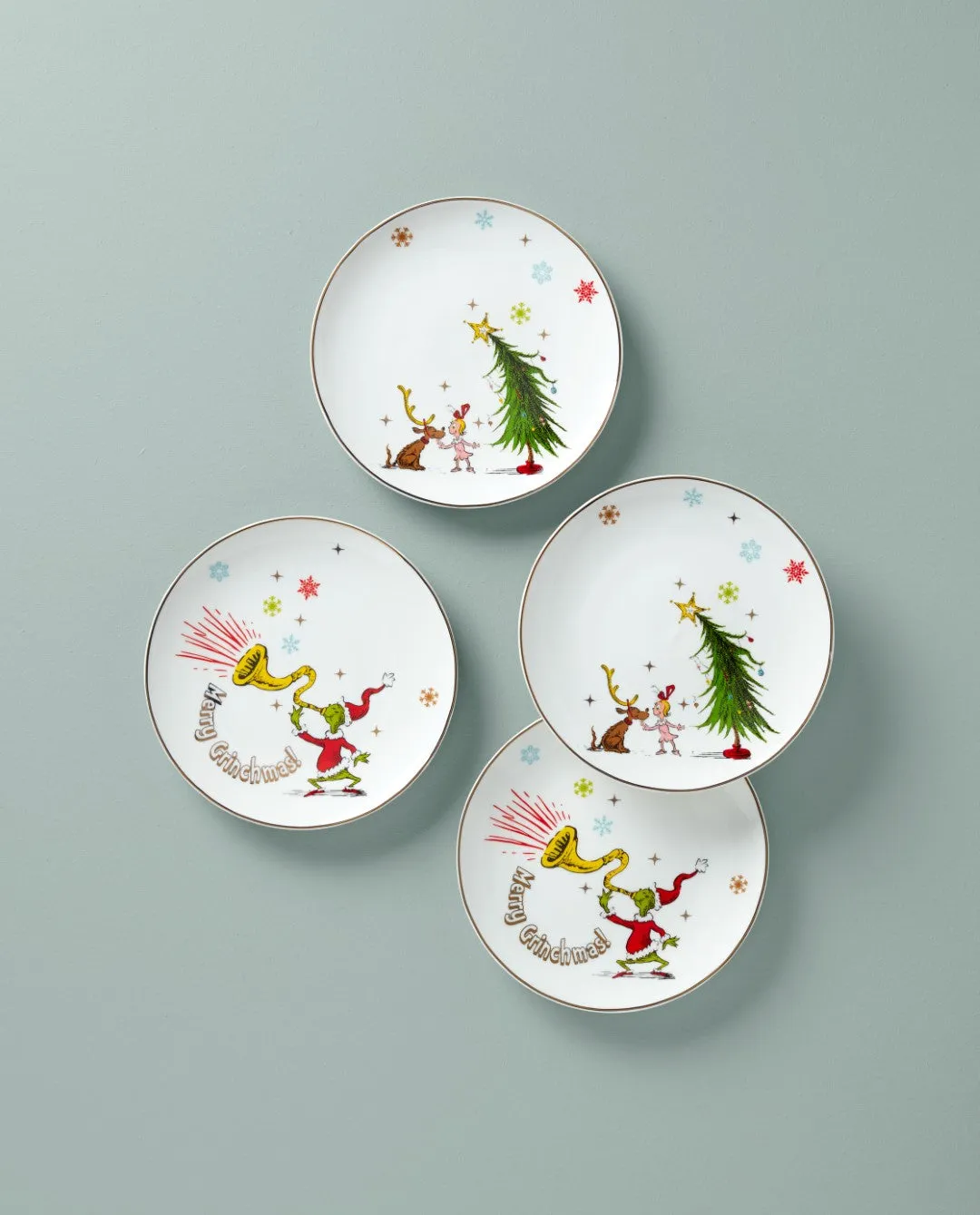 The Grinch is going to steal Christmas… and your heart] This lovely and entertaining set of accent plates features scenes of festive holiday cheer.