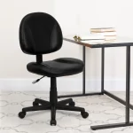 Experience superior comfort and functionality in the workplace with our Commercial Grade Mid-Back LeatherSoft Swivel Ergonomic Task Office Chair with Back Depth Adjustment. This contemporary task office chair combines sleek design with practical features to elevate your office experience. The black LeatherSoft upholstery exudes sophistication, while the mid-back design and back depth adjustment knob ensure personalized comfort tailored to your upper leg length. The accordion back cover and contoured back and seat, filled with CAL 117 fire retardant foam, offer optimal support during long work hours. The pneumatic swivel seat height adjustment, heavy-duty nylon base, and dual wheel casters provide smooth mobility and stability. LeatherSoft, a blend of leather and polyurethane, enhances the chair’s softness and durability.Key Features and Specifications: