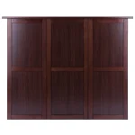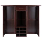 The Newport Wine Bar is an excellent entertaining and storage solution. The countertop expands for when the extra space is needed when guests arrive and folds down to save space whenever needed. The overall size when closed is 20.3’W x 17.8’D x 40.1’H and when open is 50’W x 17.8’D x 40.1’H and offers storage for 9 wine bottles and three rows of hanging wine glasses. The drawer is 11.3’W x 11.8’D x 3.8’H. The open shelf is 39.3’H x 15.5’W x 13.1’D. The wine rack slot is 3.9′ x 3.5′ and the wine glass holder fits 9 glasses at 3.5′ diameter and may fit more with smaller glasses. Made of solid and composite wood in a walnut finish. Assembly required.