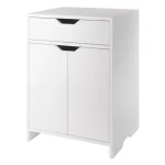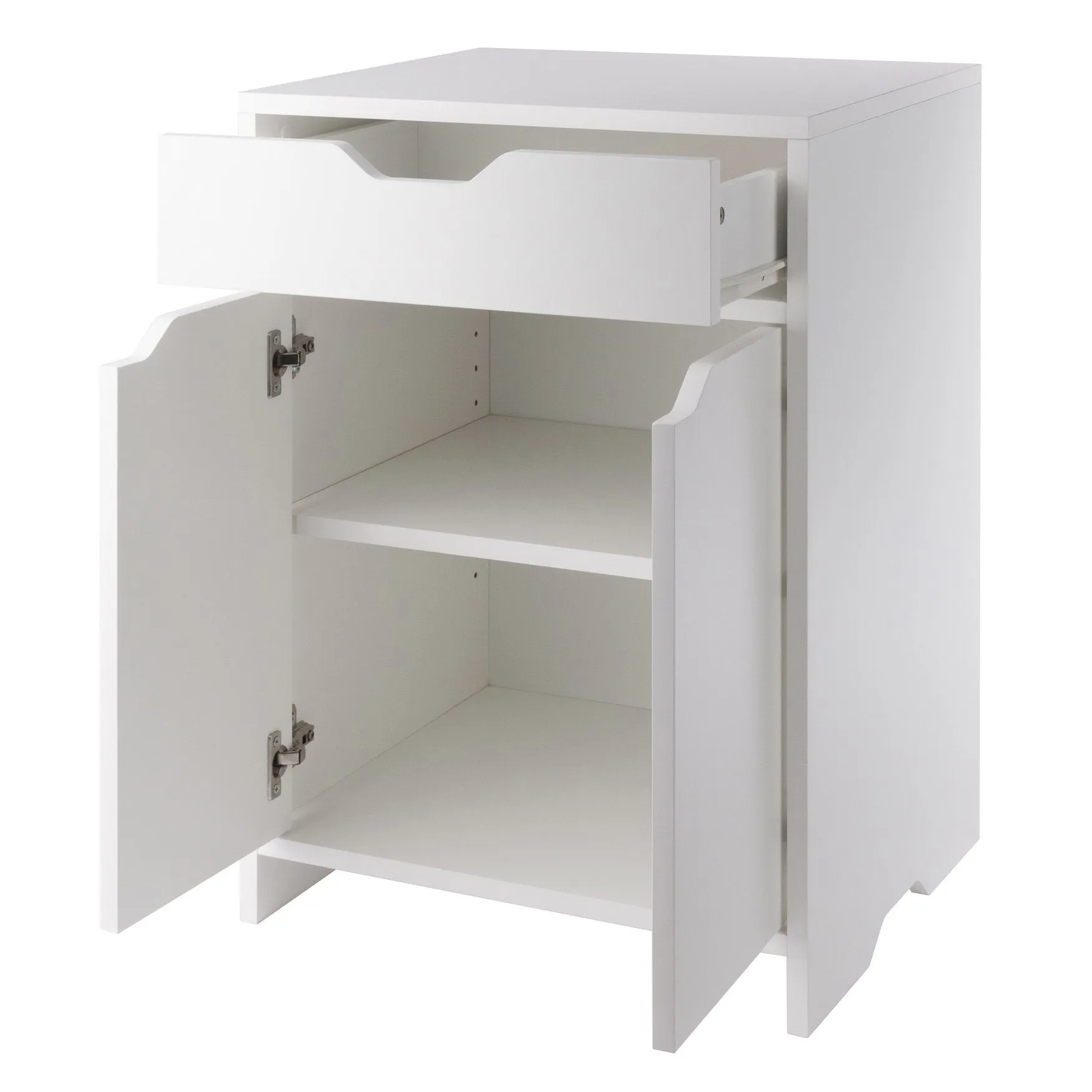 The Winsome Wood Nova 1-Drawer Storage Cabinet offers a streamlined way to transform any room where you need stylish, easy-access storage. This freestanding cabinet is ideal in a home office for keeping office supplies while doubling as a printer stand. In a garage or shed, it’s a great organizer for tools and gardening equipment. Or use it as a side table in a child’s bedroom to reduce the clutter of toys, electronics, and sports gear. The flexibility of the shelf makes it adaptable to a variety of storage needs as you can adjust the height or simply remove it. The cut-out handles and clean white finish provide a contemporary, simple look. For additional storage, combine with other organizers from the Winsome Nova collection. Made of sturdy composite wood, it conveniently ships in 1 box with all the hardware needed for assembly. Replacement part request can be submitted directly to the manufacturer, with sales receipt, within 60 days from date of purchase.Overall dimensions: 19.2’W x 15.9’D x 26.3’HCabinet shelf is removable and adjustableInside cabinet: 17.9’W x 14.7’D x 17.5’H (with shelf removed)Inside drawer dimensions: 16’W x 11.7’D x 2.5’HDistance from ground to bottom panel: 2.2’HStatic weight capacity: 50 lbs. (top); 12 lbs. (drawer); 25 lbs. (each shelf)Assembly requiredShips in 1 box