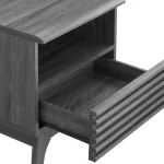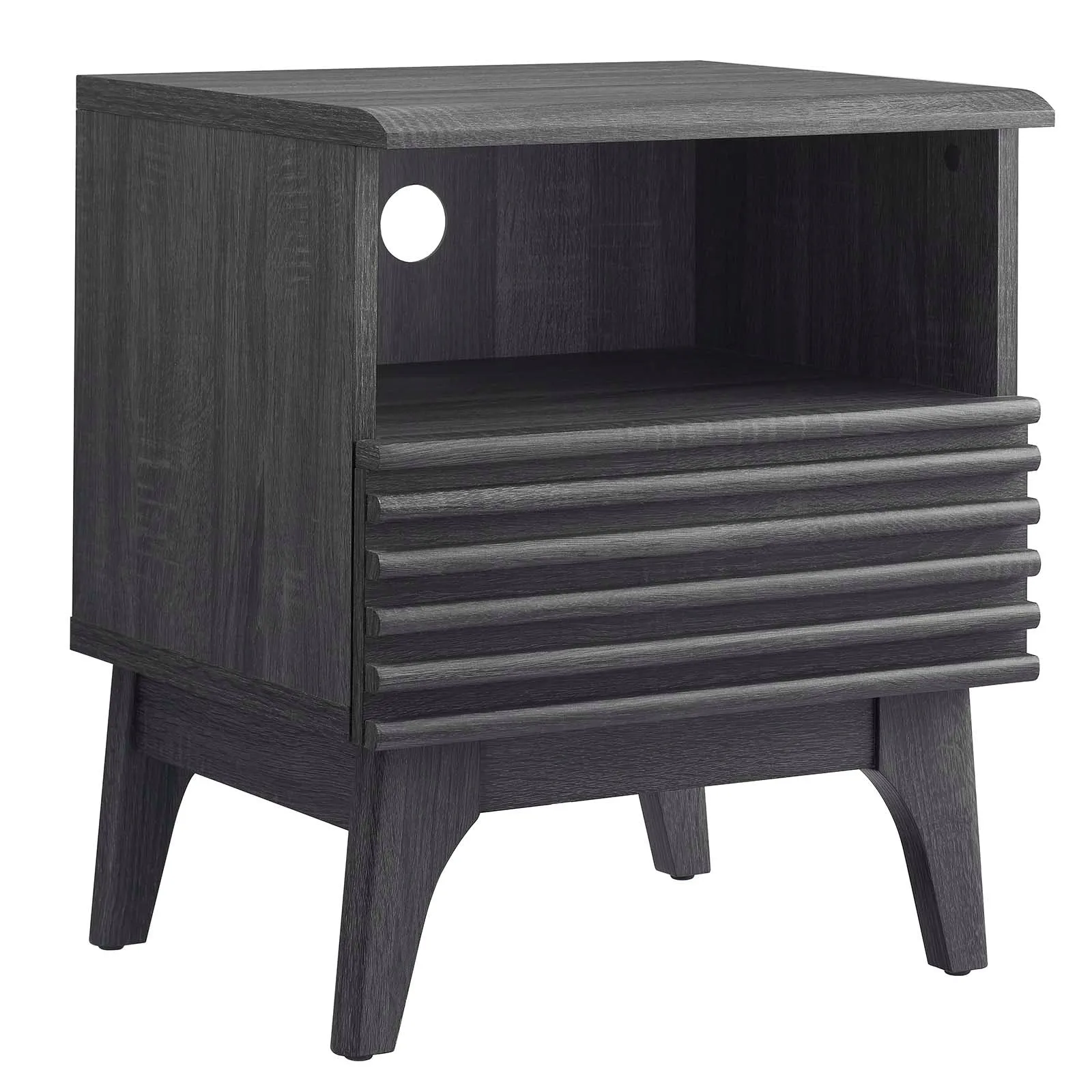 Tap into mid-century aesthetics with the Render Nightstand. With dual usage as an end table in the living room, this nightstand features a durable particleboard frame with a smooth wood grain laminate, four tapered wood legs, open storage area with cable management hole, and a full-extension glide drawer. Boasting a mid-century modern style this accent table features a solid construction with a pleasing look and practical functionality that’s perfect for the bedroom. The full-extension drawer offers ample storage space to keep your bedside essentials neat and organized.
