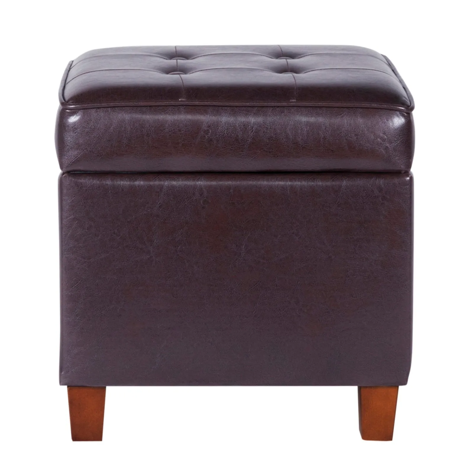 This square shaped ottoman will be a classic stylish and multipurpose addition to your home. With wooden frame, this brown faux leather upholstered ottoman, has button tufted lift off lid, providing storage space to store linens, drapes, blankets, extra pillows, controllers, magazines. Place this ottoman in your living room or bedroom as a storage space; pair it along with a recliner or chair, as a comfortable place to rest your foot after a long day at work or it can also be used as an additional seating.