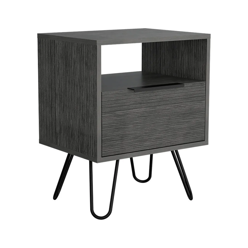 - Modern style nightstand with a sleek gray frame and matching top color.