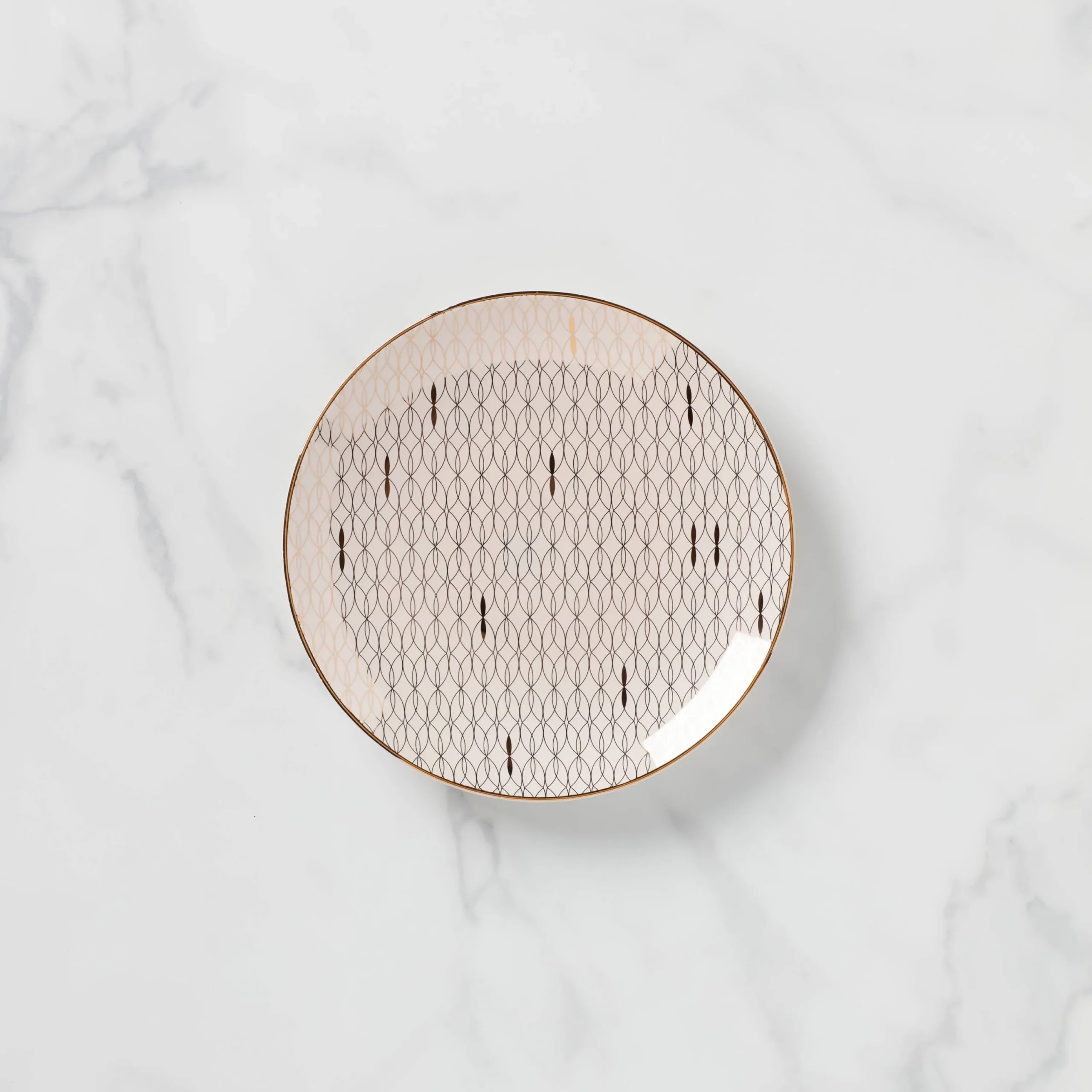 Accented with microwave-safe gold trim, the Trianna Salad Plate boasts a blush pink hue and a fashion-forward gold woven geometric pattern. Crafted in dishwasher-safe durable ceramic porcelain in a coupe design, this artful modern design is perfect for serving sides, sandwiches and desserts.