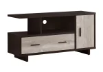 - Contemporary TV stand in a casual two-tone espresso and taupe reclaimed wood-look