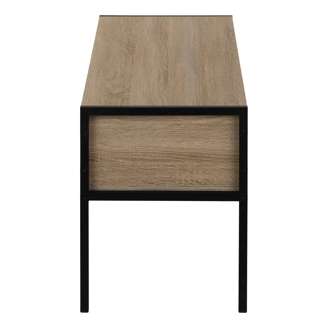 This streamlined TV stand with storage will give your living room or bedroom a leg up on style. Boasting an industrial-inspired design, it features a slender black metal frame with tall legs. The top panel, open shelf, and drawer in a dark taupe wood-look finish offer flexible storage solutions for your entertainment center components. Most TVs can be accommodated on the top panel when centered, while the shelf underneath is open in the back for easy cable management. The drawer can be positioned on the left or right as desired and glides smoothly on metal drawer slides. With its compact design and clean lines, this media console is great for a condo, apartment, or small home.