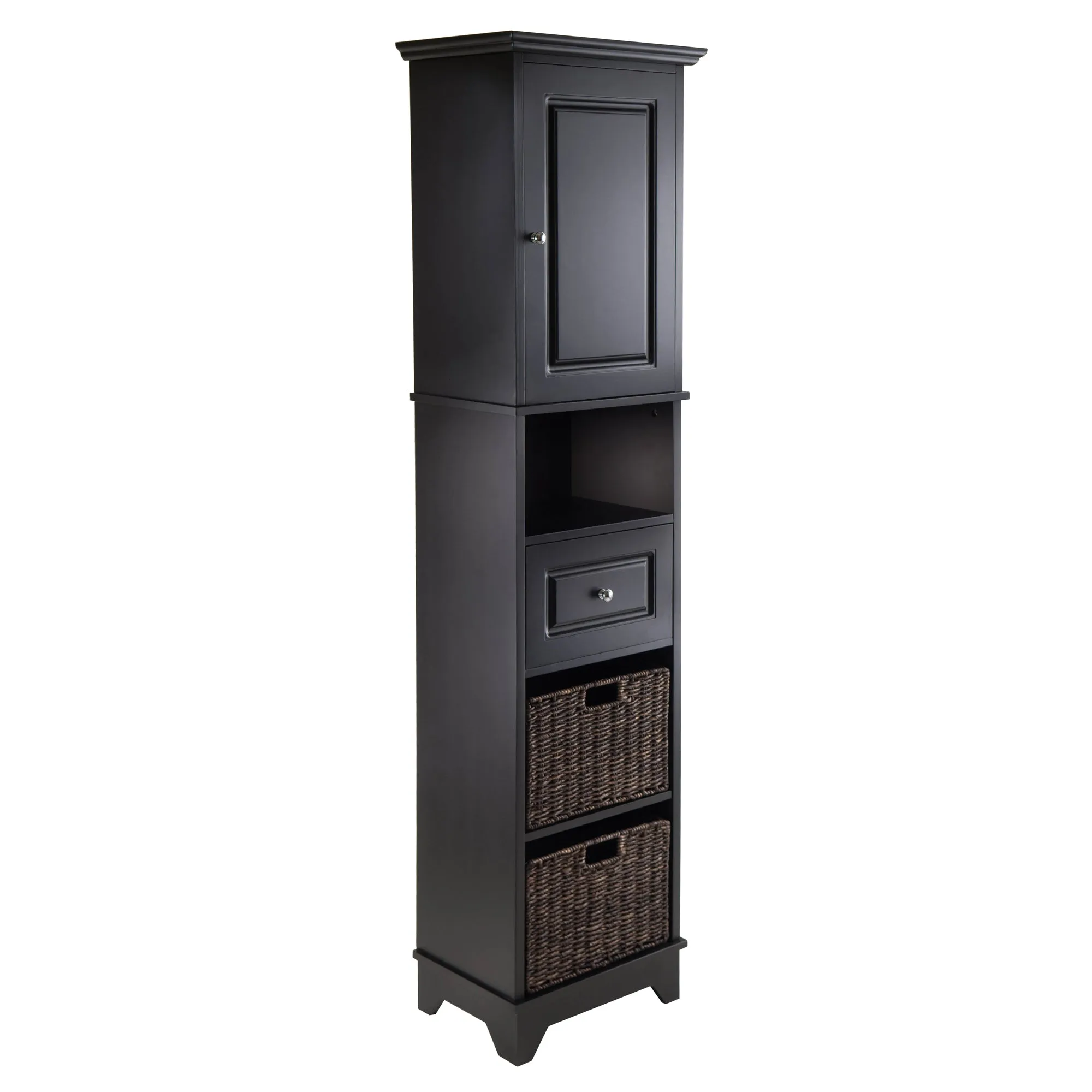 Ideal for anywhere in your home, the Winsome Wood Wyatt Cabinet is stylish and functional. Its elegant, rich black finish will add a touch of sophistication to any interior. It provides plenty of storage space for books, art, photos and more. The top of this black wooden cabinet features a wooden door with an adjustable shelf within. The middle section has open storage compartment and a drawer. The bottom includes a two-section storage area. Included with this unit are two foldable chocolate tone baskets that are a perfect fit for the bottom storage or to use anywhere else that may be convenient. So whether it’s in your living room, office or walk-in closet, this cabinet is constructed out of medium-density fiberboard (MDF) and is sure to deliver durable performance for years. The Winsome Wyatt Cabinet is ready for assembly, while the baskets only need to be prompt up and will be ready to use. Conveniently ships in 1 box. Replacement parts can be requested directly to the manufacturer within 60 days from date of purchase